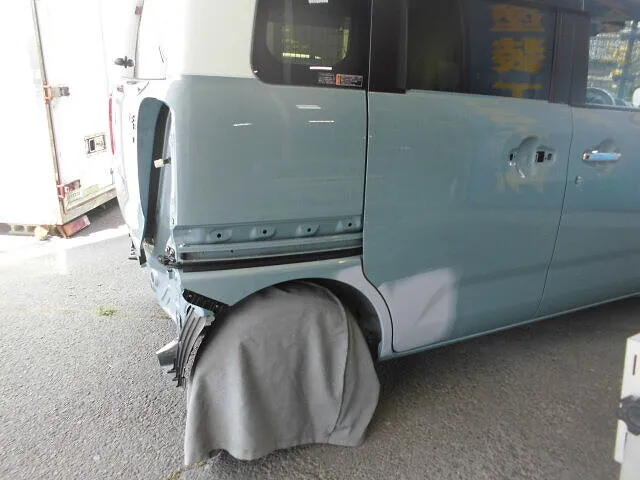 富士市 鈑金塗装 ホンダ N BOX 左リヤドア交換、アウトサイドパネルキズ修理塗装
