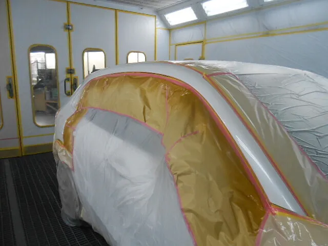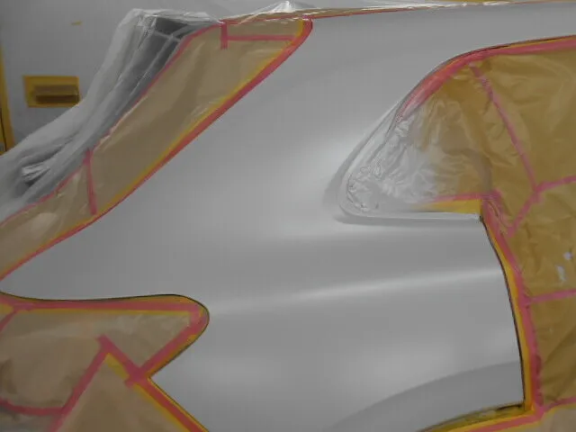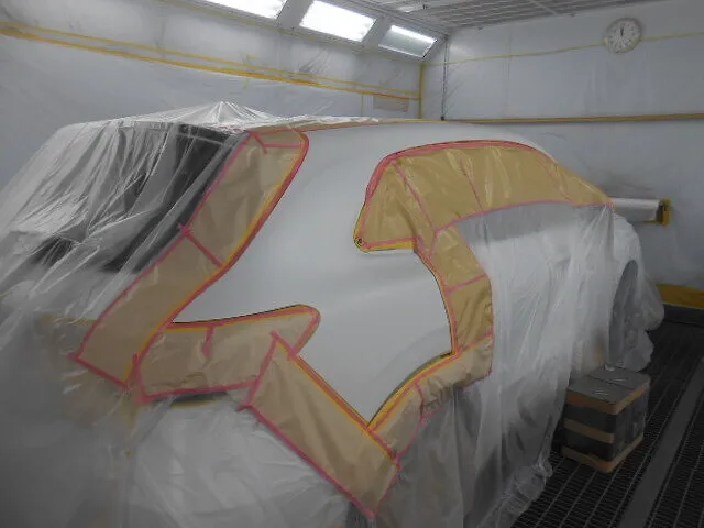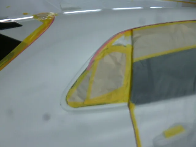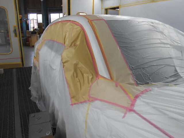 作業場に入ると、まず目に飛び込んでくるのがマスキングされた車体。