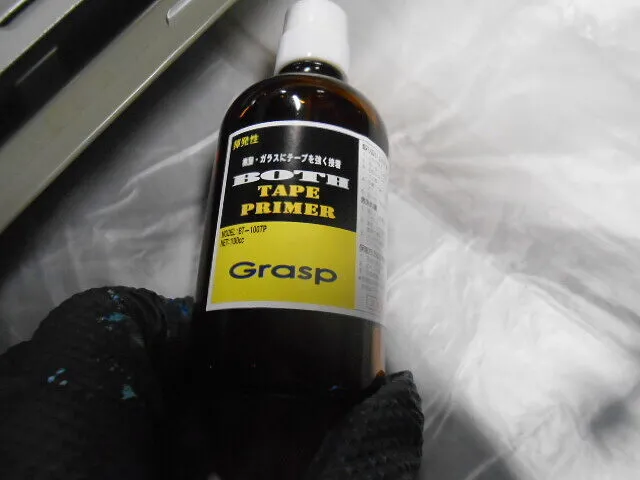 作業場で手に取られているのは、プライマーのボトルです。鈑金塗装の現場では、このような下処理剤が大切な役割を果たします。