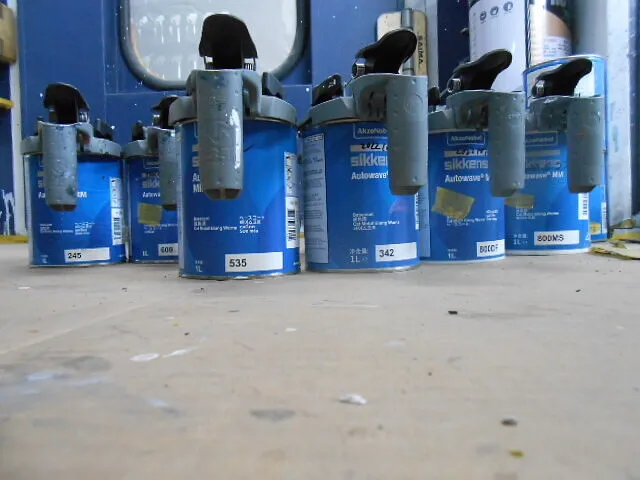 作業場の片隅に並ぶ塗料缶たち。毎朝、スタッフが一つひとつ手に取り、