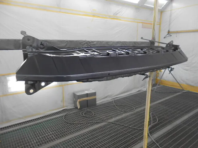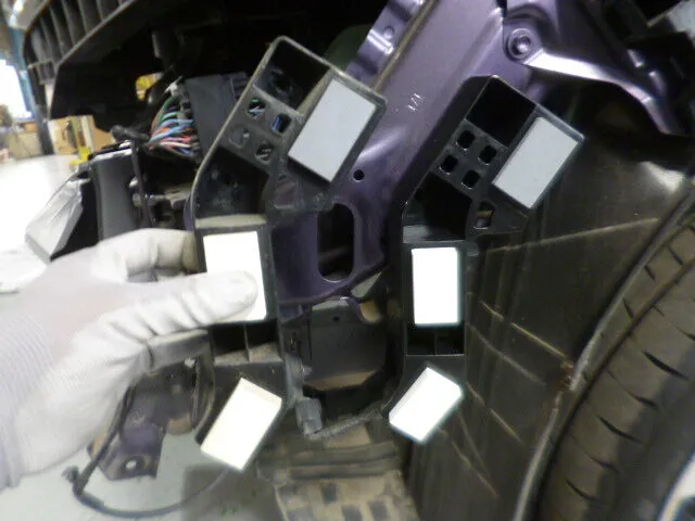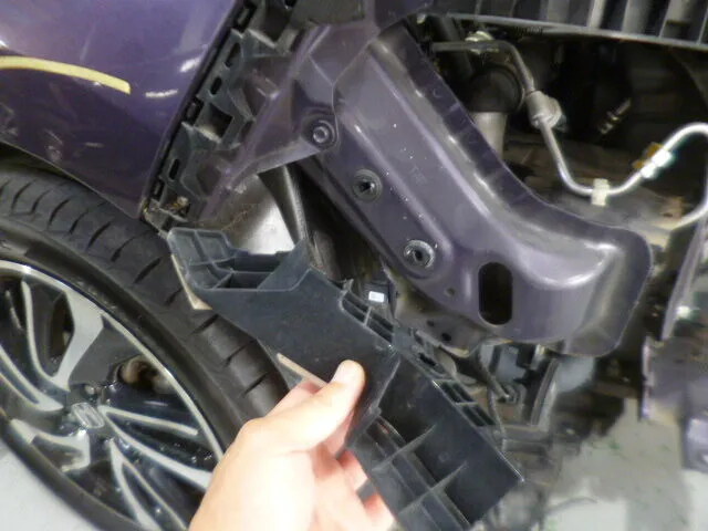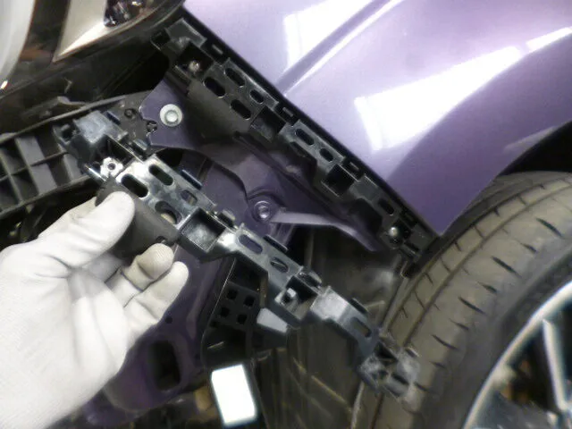 フロントバンパーの一部が丁寧に取り外されている様子が、工場内の明るい作業スペースで