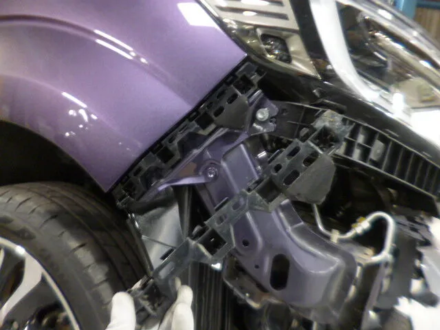 今回はフロント部分の修理ということで、職人が丁寧にバンパー交換やフェンダー鈑金塗装、そしてサスペンションまでしっかり点検しています。