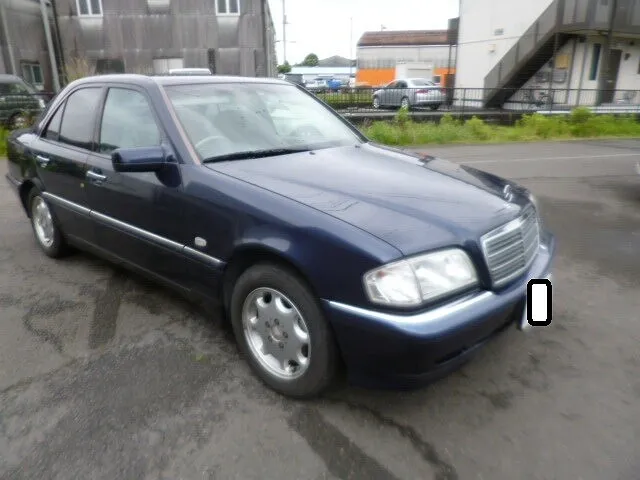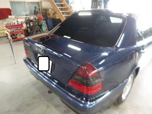 工場の一角で、ベンツC240が静かに作業を待っています。普段は街中を颯爽と走るこの車も、時には右リヤドアやトランクに小さなキズを負ってしまうことがありますよね。
