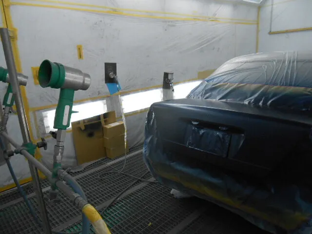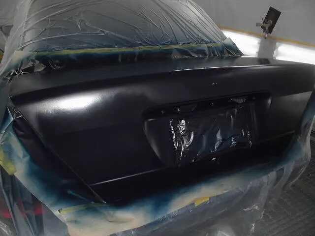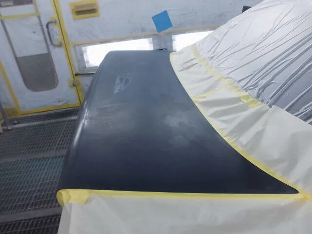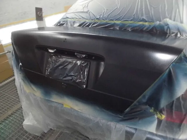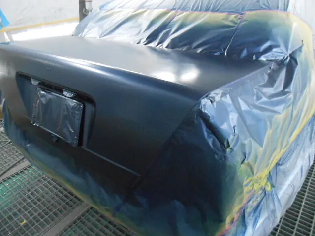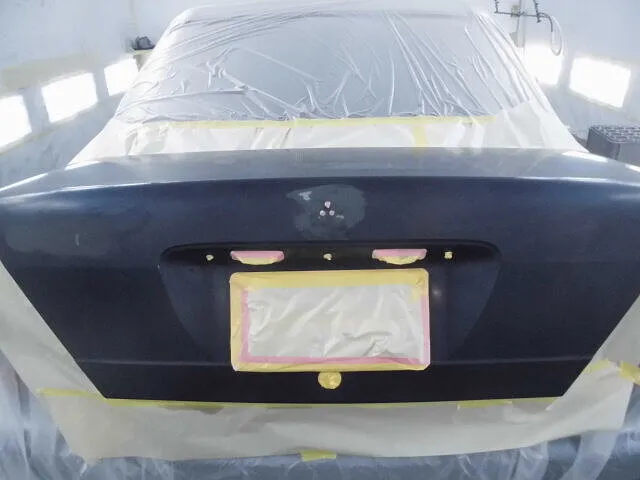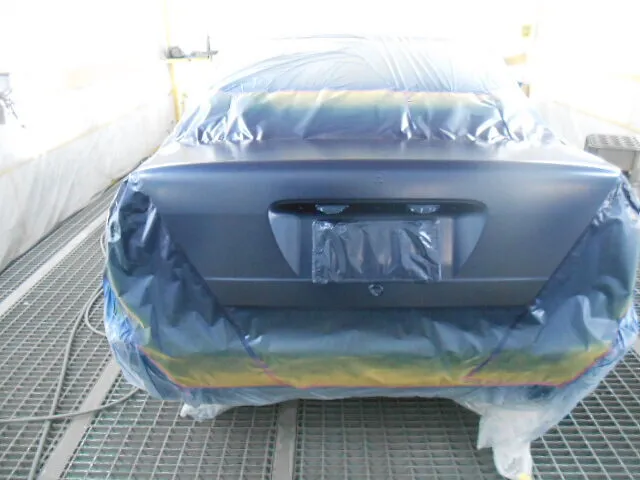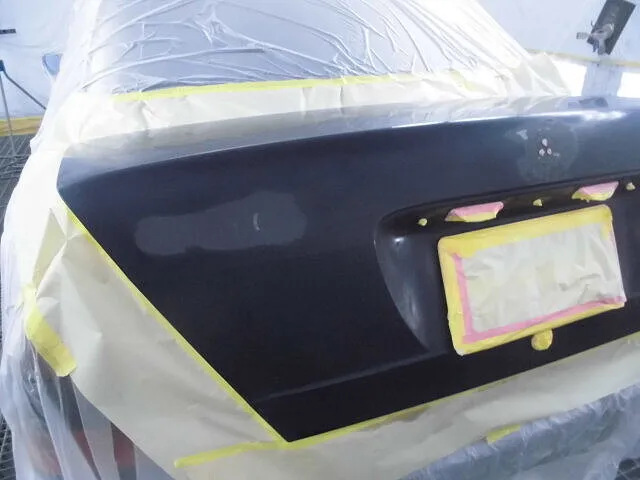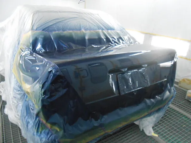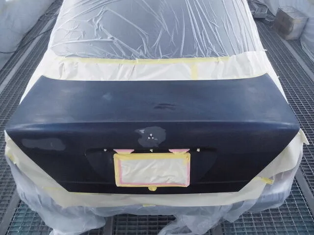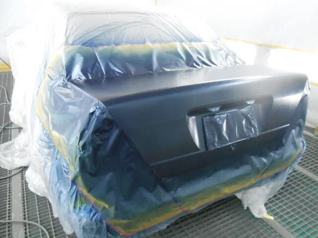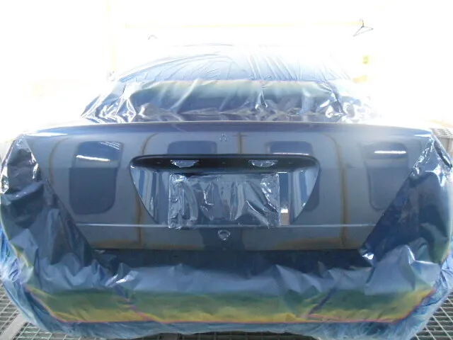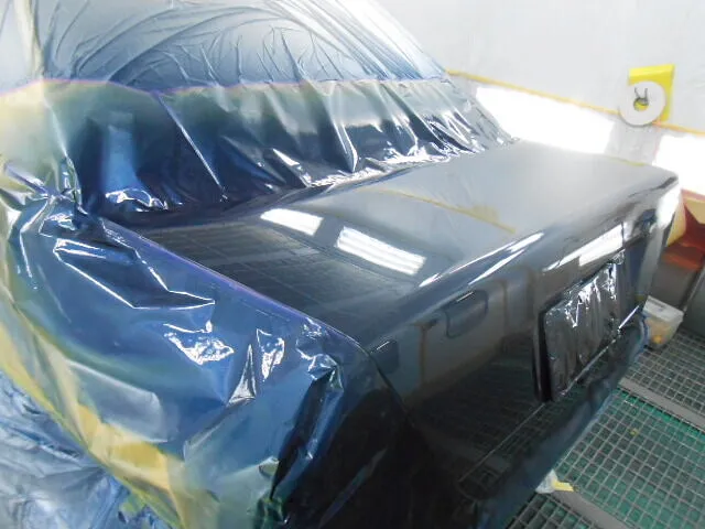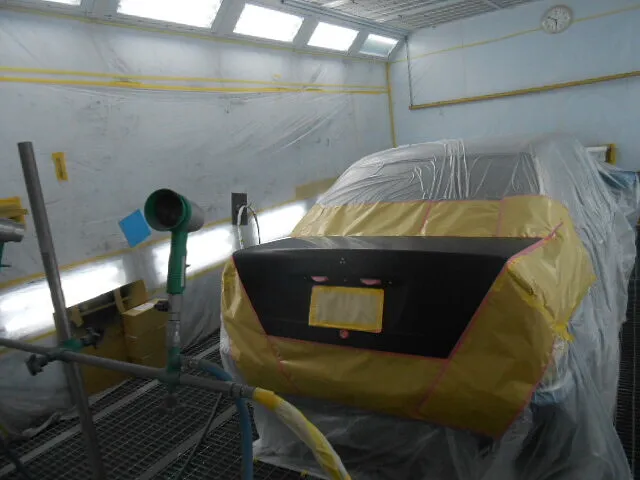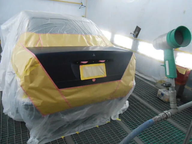塗装ブースの中で、丁寧にマスキングされたトランクが目を引きます。