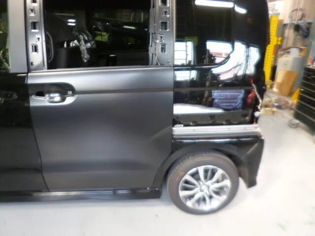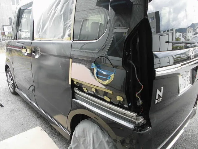富士市 鈑金塗装 ホンダ N BOX 左リヤドア交換、アウトサイドパネルキズ修理塗装