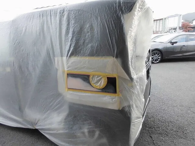 塗装ブースの中で、丁寧にマスキングされたN-BOXの姿が印象的です。