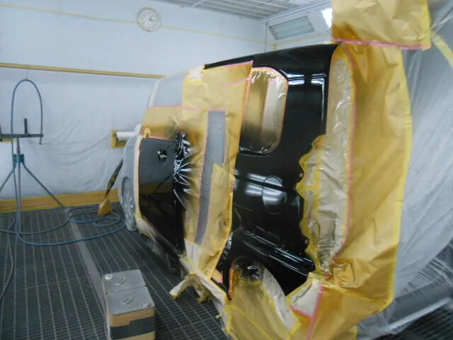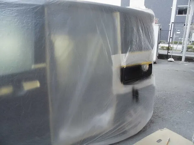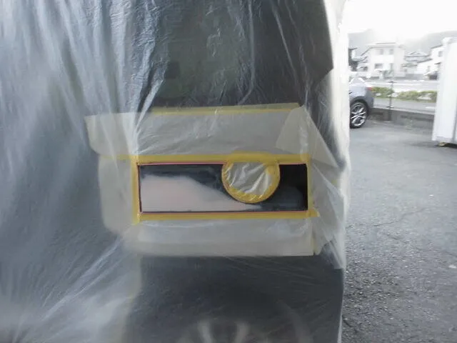 写真には、塗装前の下準備としてマスキングされた様子が写っています。