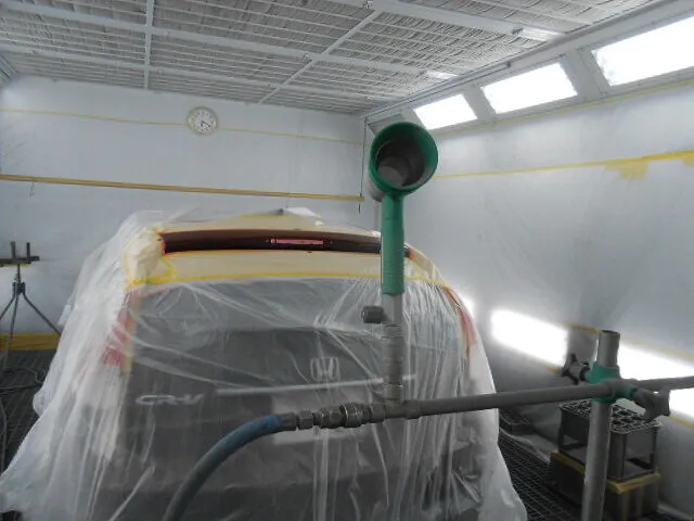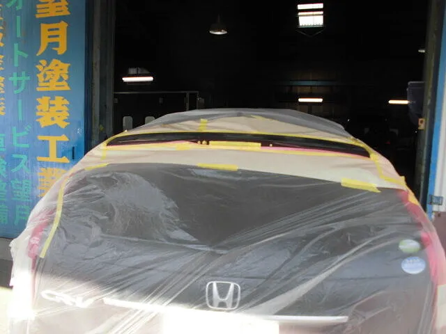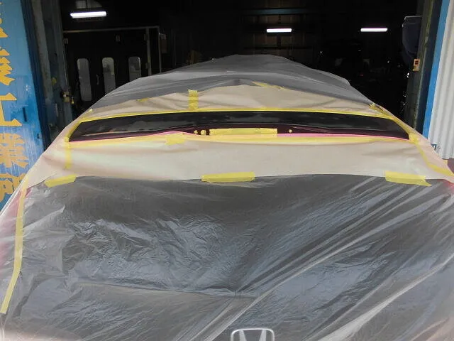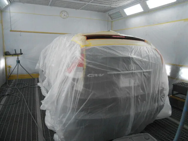 透明なシートでしっかり養生されたホンダCR-Vのリアビュー、その周囲にはプロ仕様の設備が整っています。