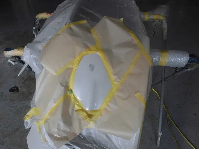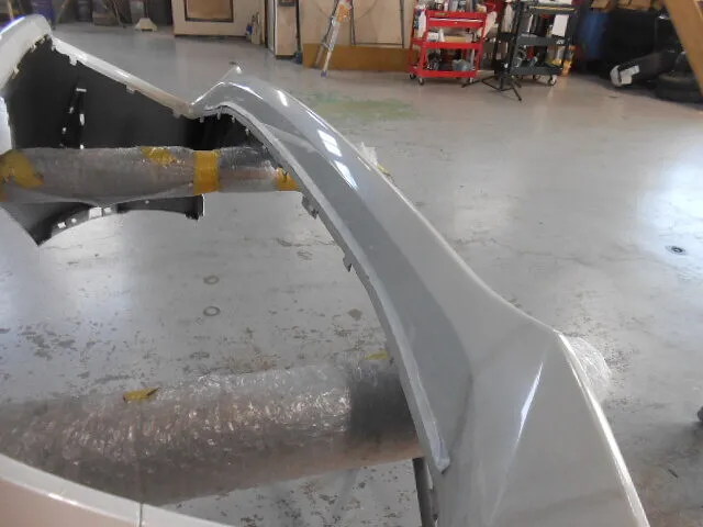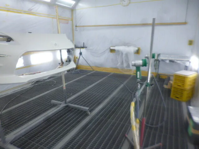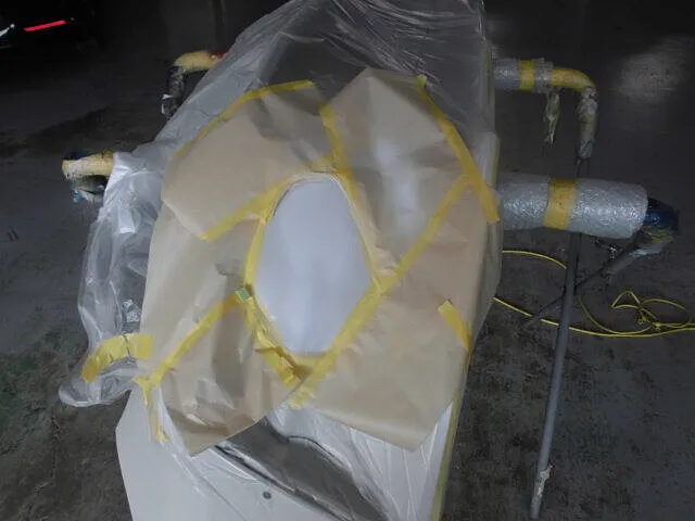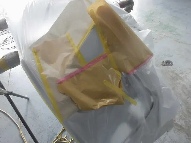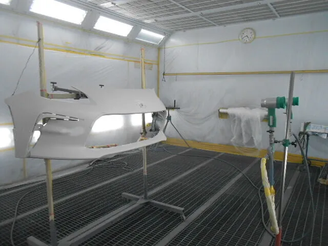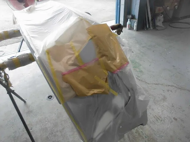 作業場の一角で、丁寧にマスキングされたフロントバンパーが目を引きます。
