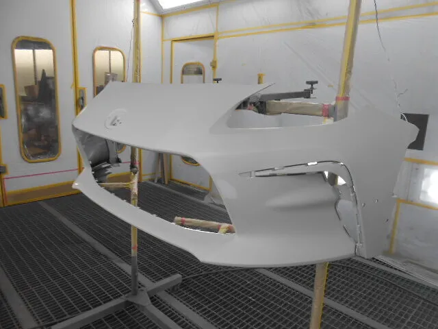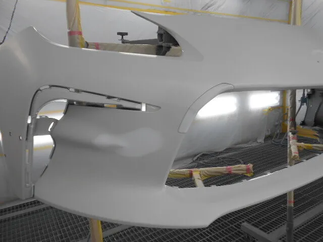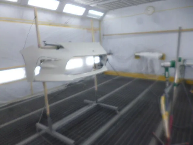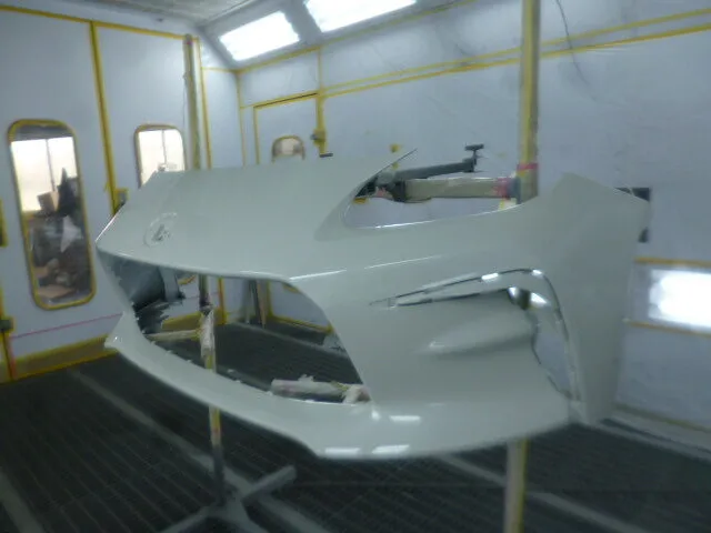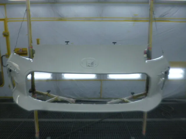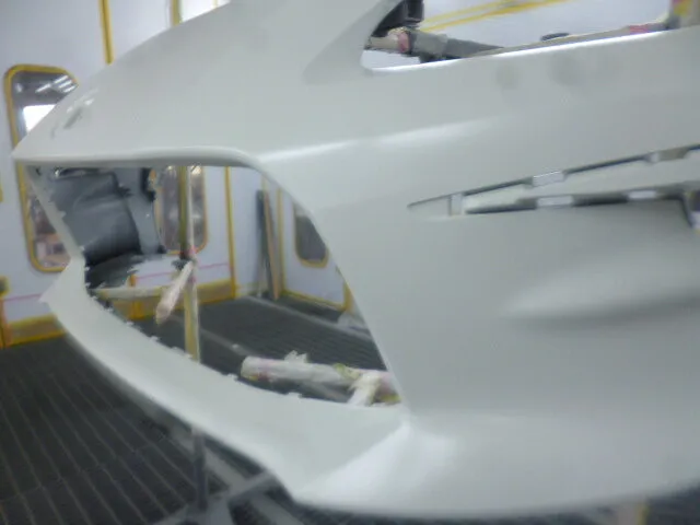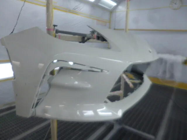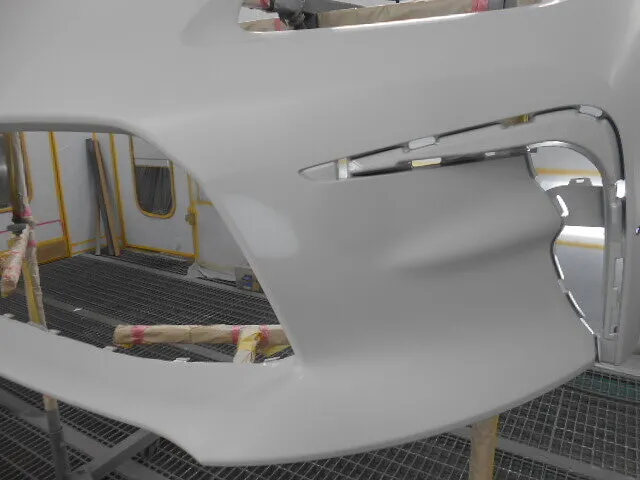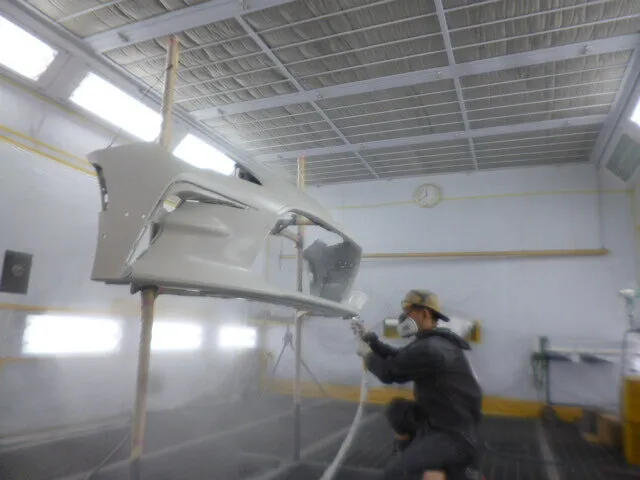 作業場に広がる静かな緊張感の中、フロントバンパーが丁寧に塗装されていく様子が印象的です。