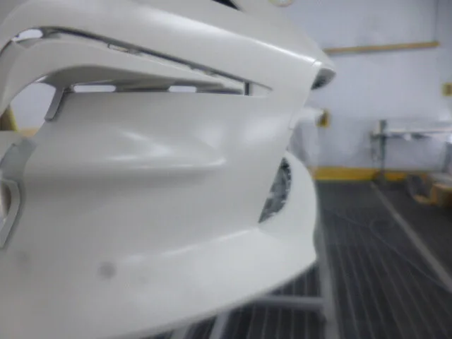 工場の一角で、丁寧に養生されたフロントバンパーが作業台に置かれています。
