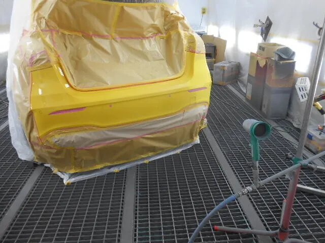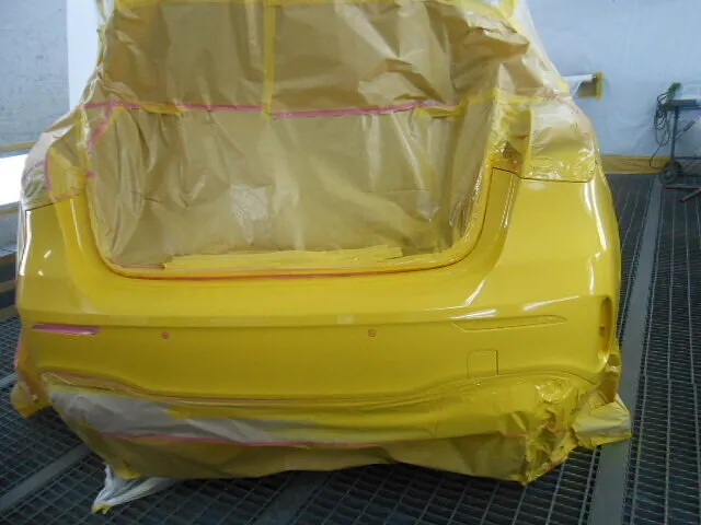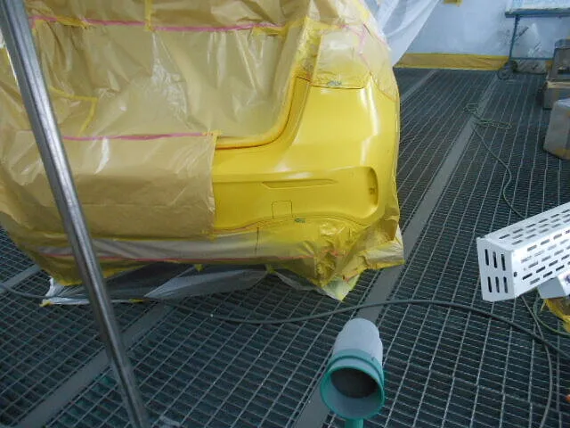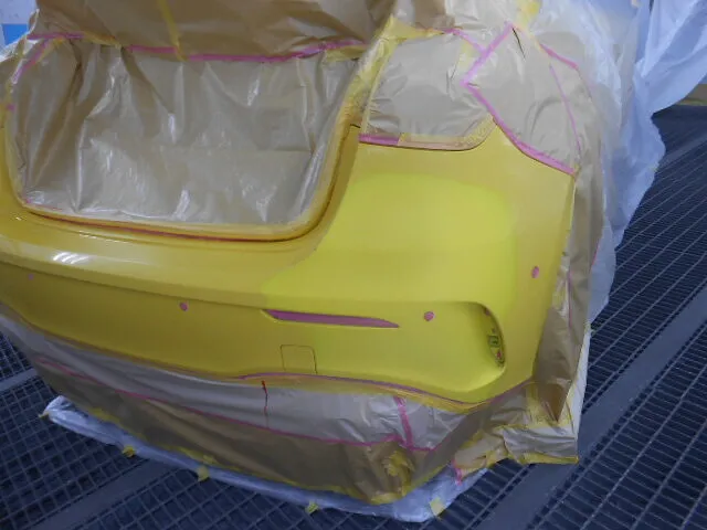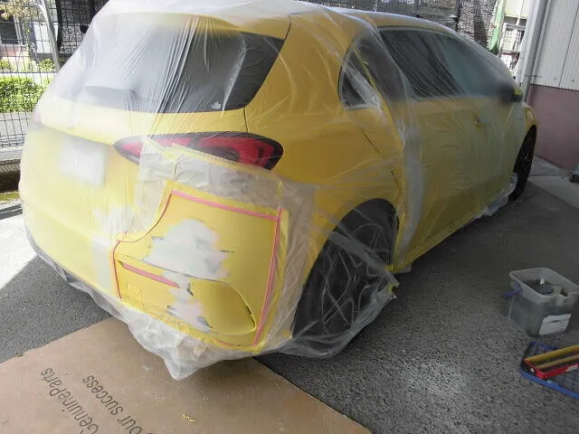 リヤバンパーが丁寧にマスキングされ、作業場の静かな空気の中で