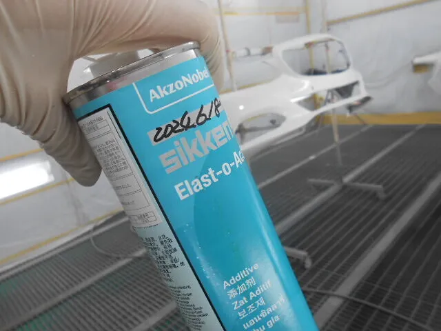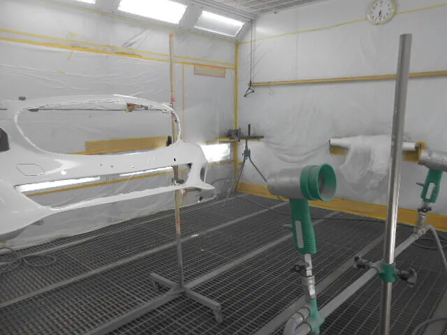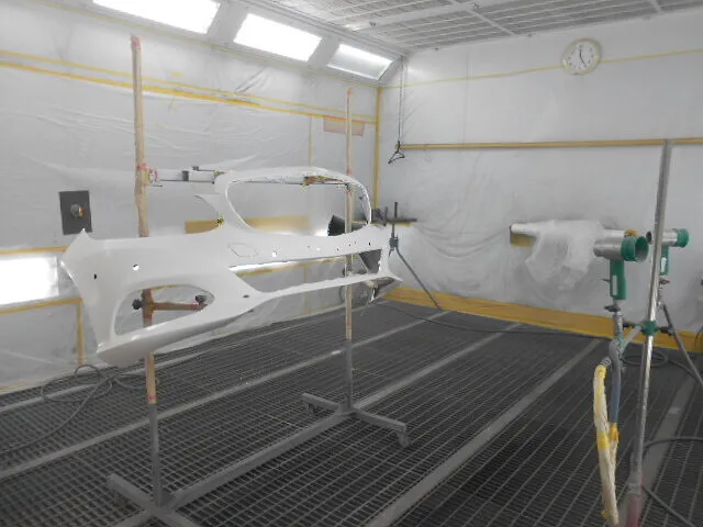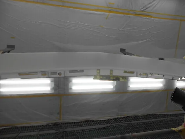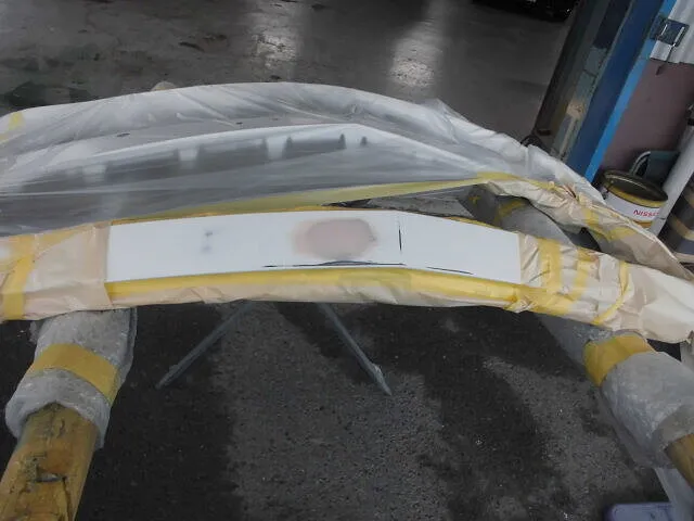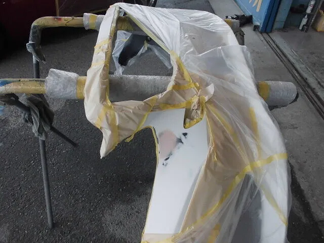 作業場に並ぶバンパーの一部、丁寧にマスキングされた様子が印象的です。