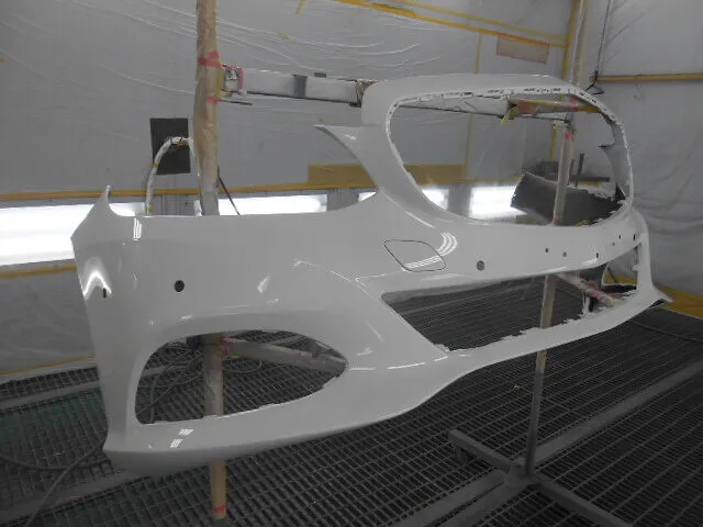 工場の一角で、丁寧に吊るされたバンパーが静かに佇んでいます。
