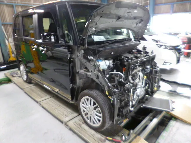 富士市 鈑金塗装 NBOX Fバンパ、フード右Fフェンダー交換、フロントサイドフレーム修理塗装