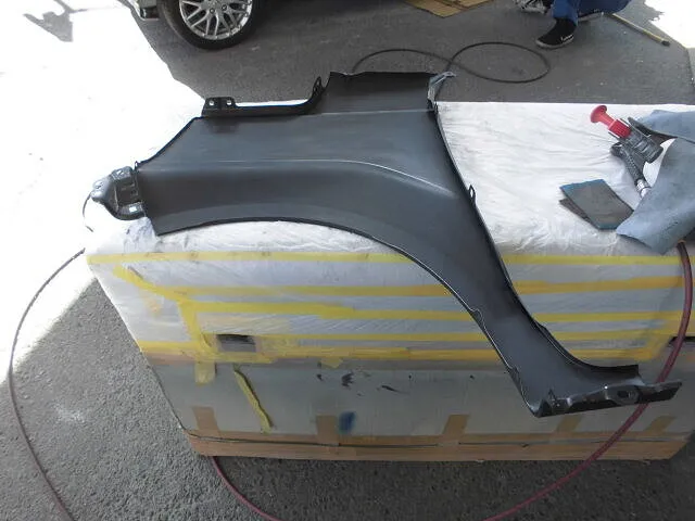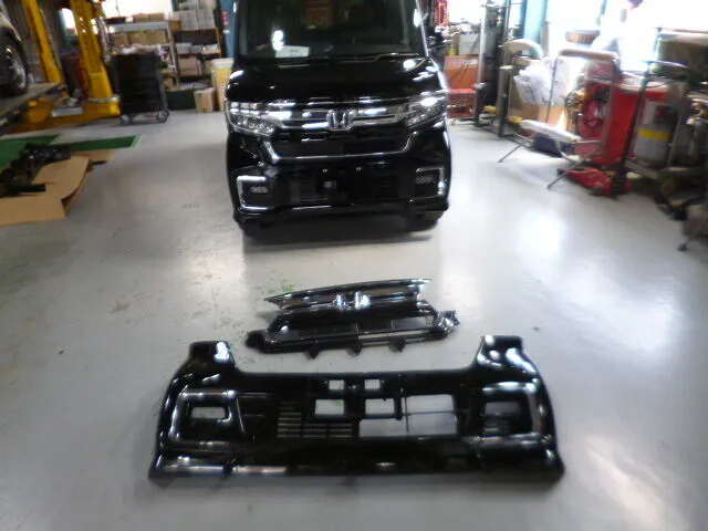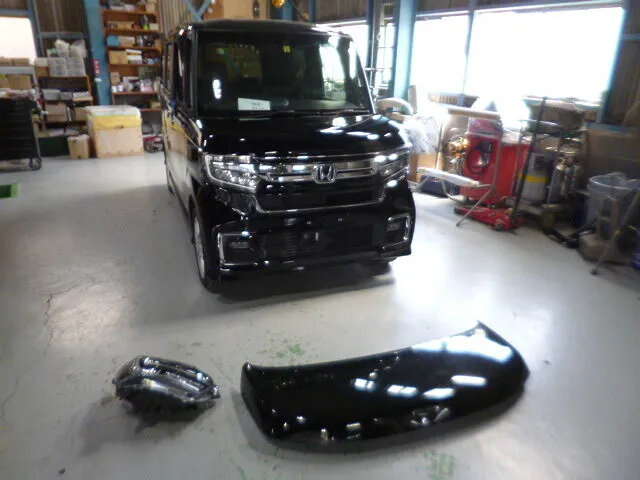 今回はNBOXのフロント部分、特にバンパーやフェンダーなど重要なパーツ交換と修理塗装を進めています。