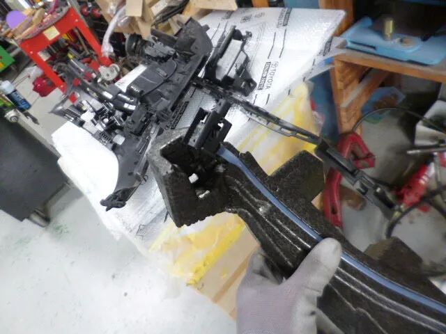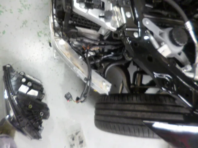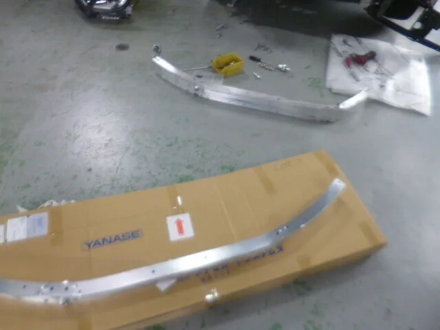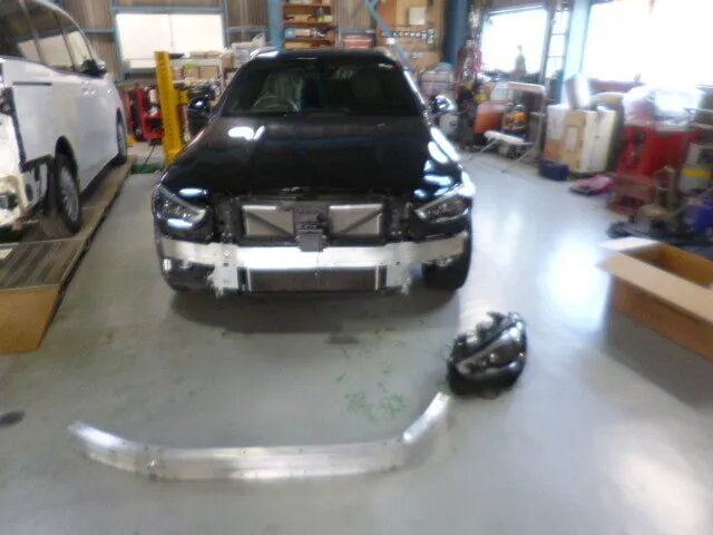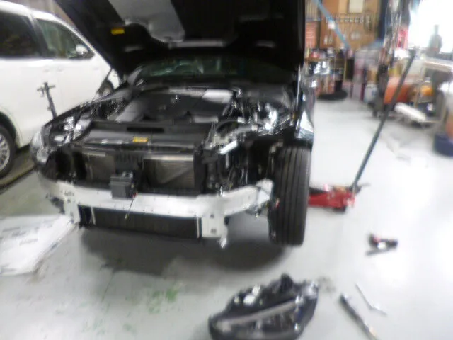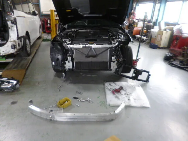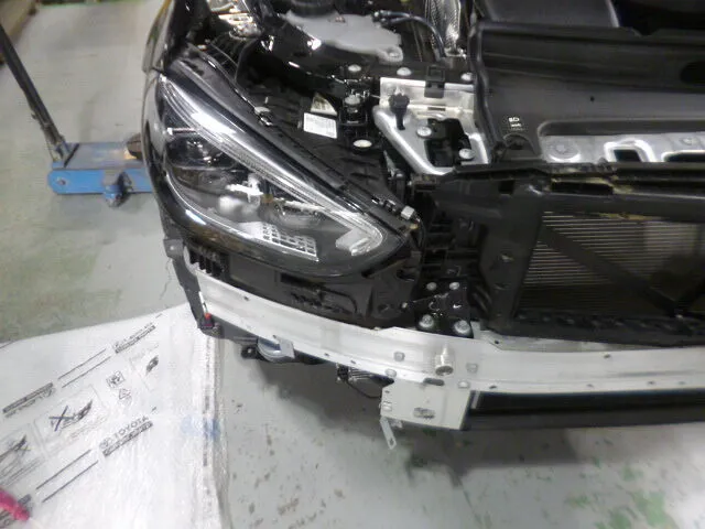 この瞬間も、スタッフは丁寧な手つきでフロントバンパーの交換準備を進めていました。