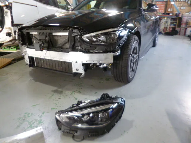 今回はベンツC200のフロントバンパー交換作業中の一コマです。