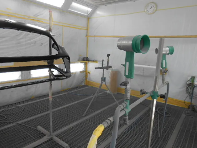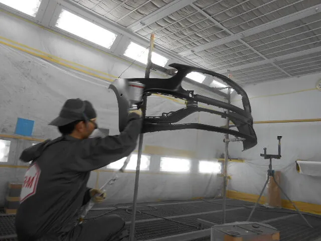 作業場の片隅で、§フロントバンパー§の裏側をじっと見つめるスタッフがいます。