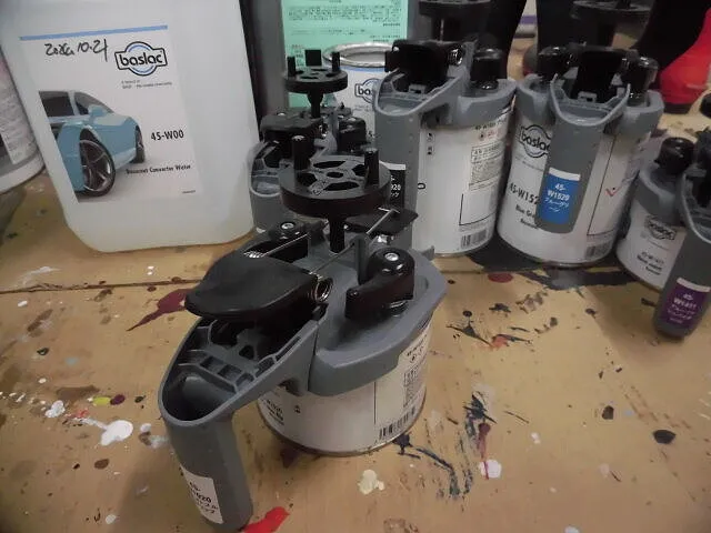 明るい作業場で、職人が塗装ブースの中、丁寧にパーツへ色を吹き付けています。