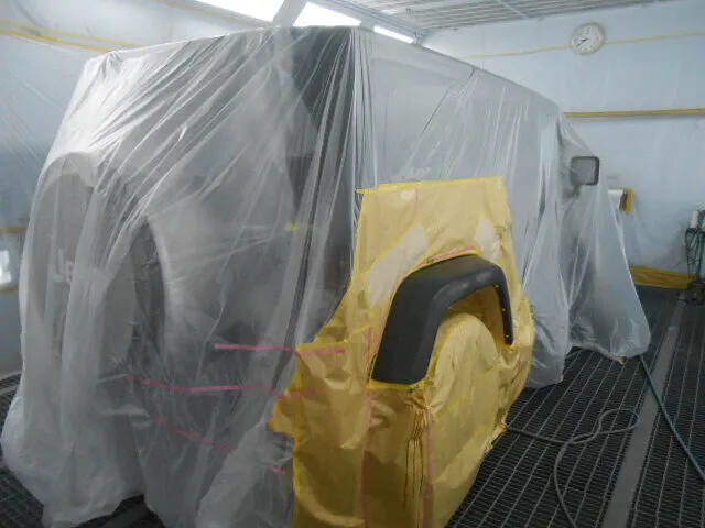 作業場の中で、丁寧にマスキングされたジープのボディ。