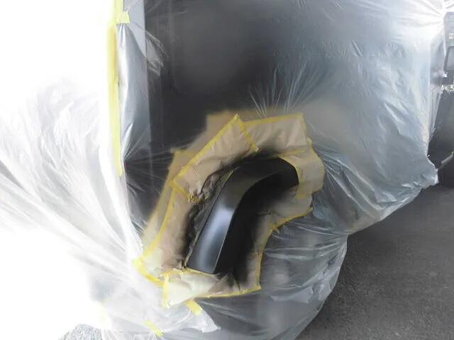 ジープの右リヤフェンダーに、丁寧にマスキングが施されている様子が写っています。