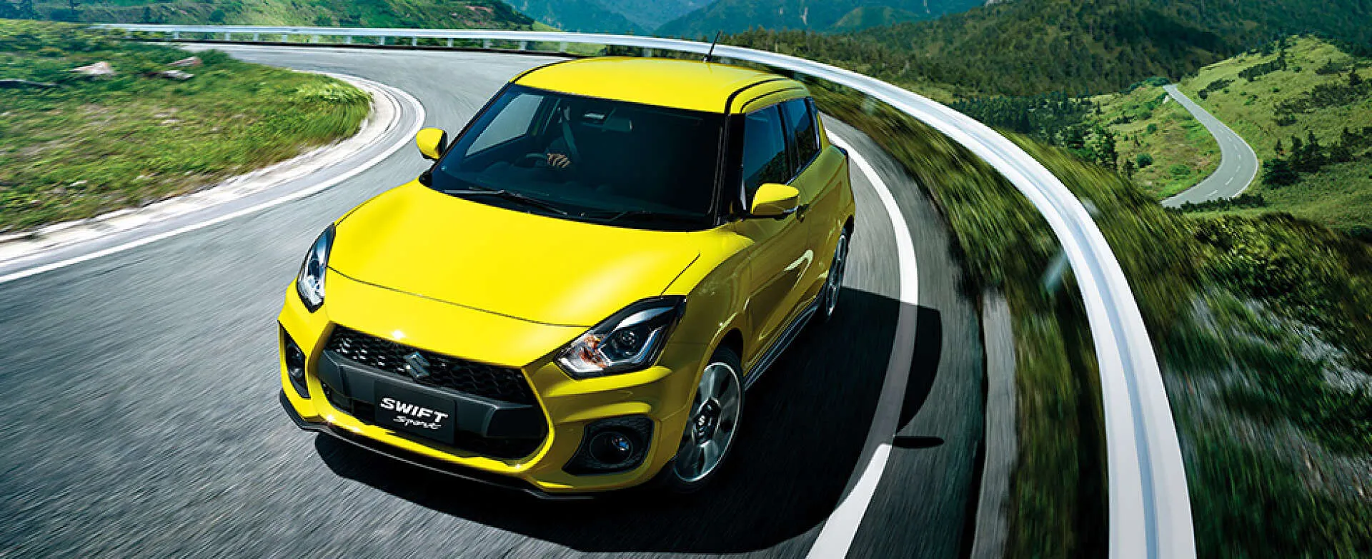 山道を颯爽と走るスイフトスポーツの姿が印象的な一枚です。静岡県 富士市でのカーリースをご利用いただいたお客様も、