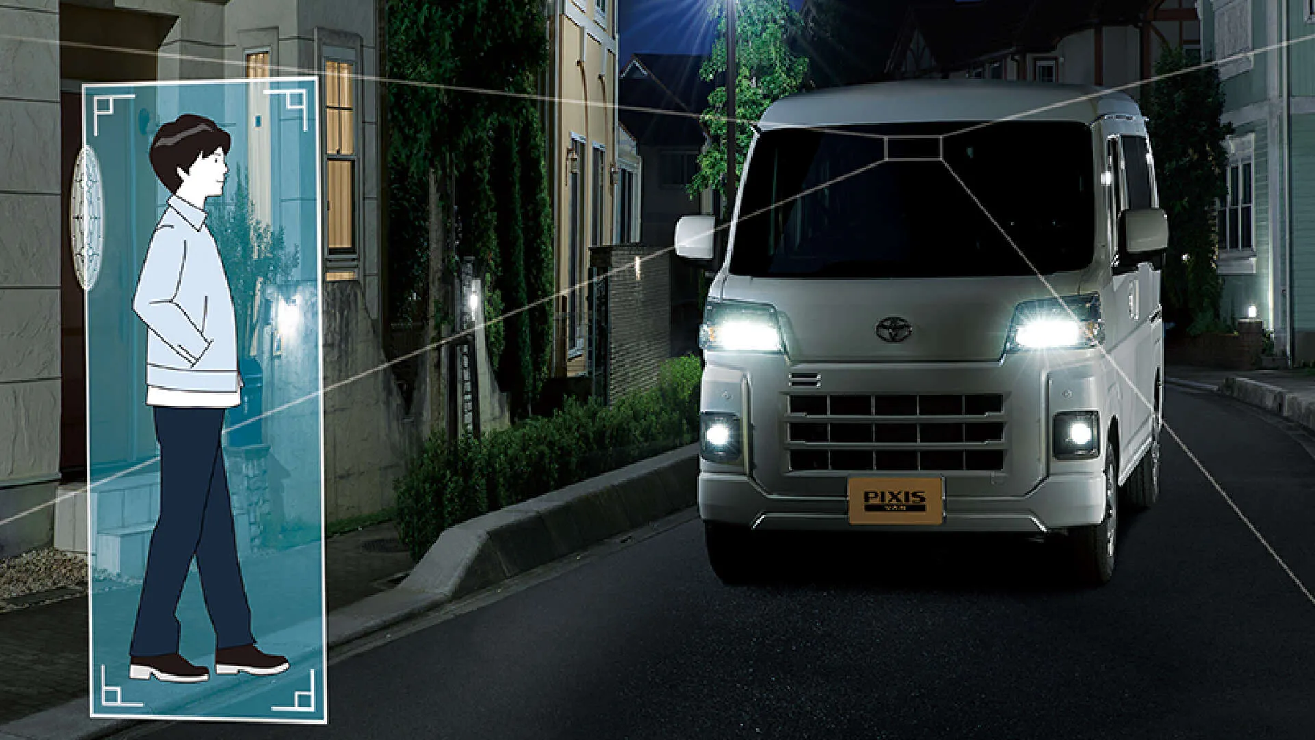 夜の住宅街で、ピクシスバンが静かに停車している様子が印象的です。ヘッドライトの明かりとともに、歩行者をしっかり検知する先進的な安全機能が感じられます。実際のお客様からは「夜遅く帰宅するときも安心できる」といった声や、「家族を乗せていても心配なく運転できる」というご意見をいただいています。