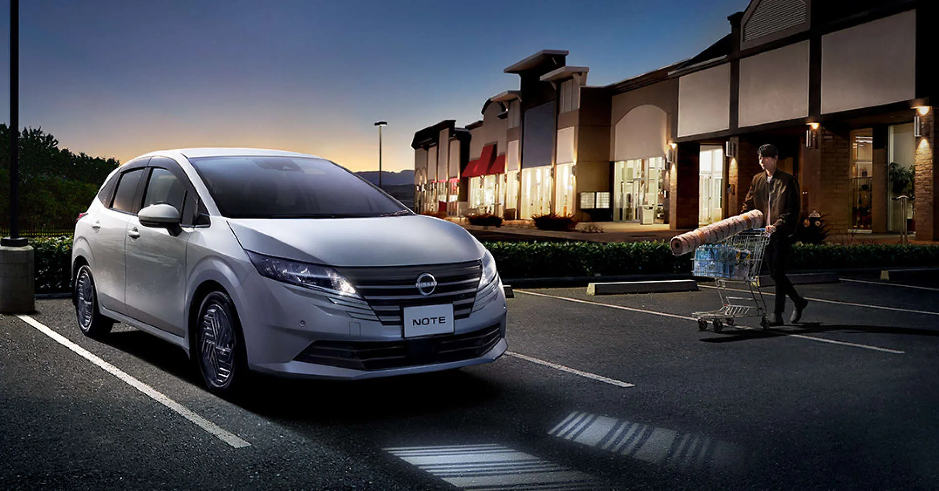 夕暮れ時のショッピングモール駐車場に停まる日産ノートが、今日も静かに待っています。