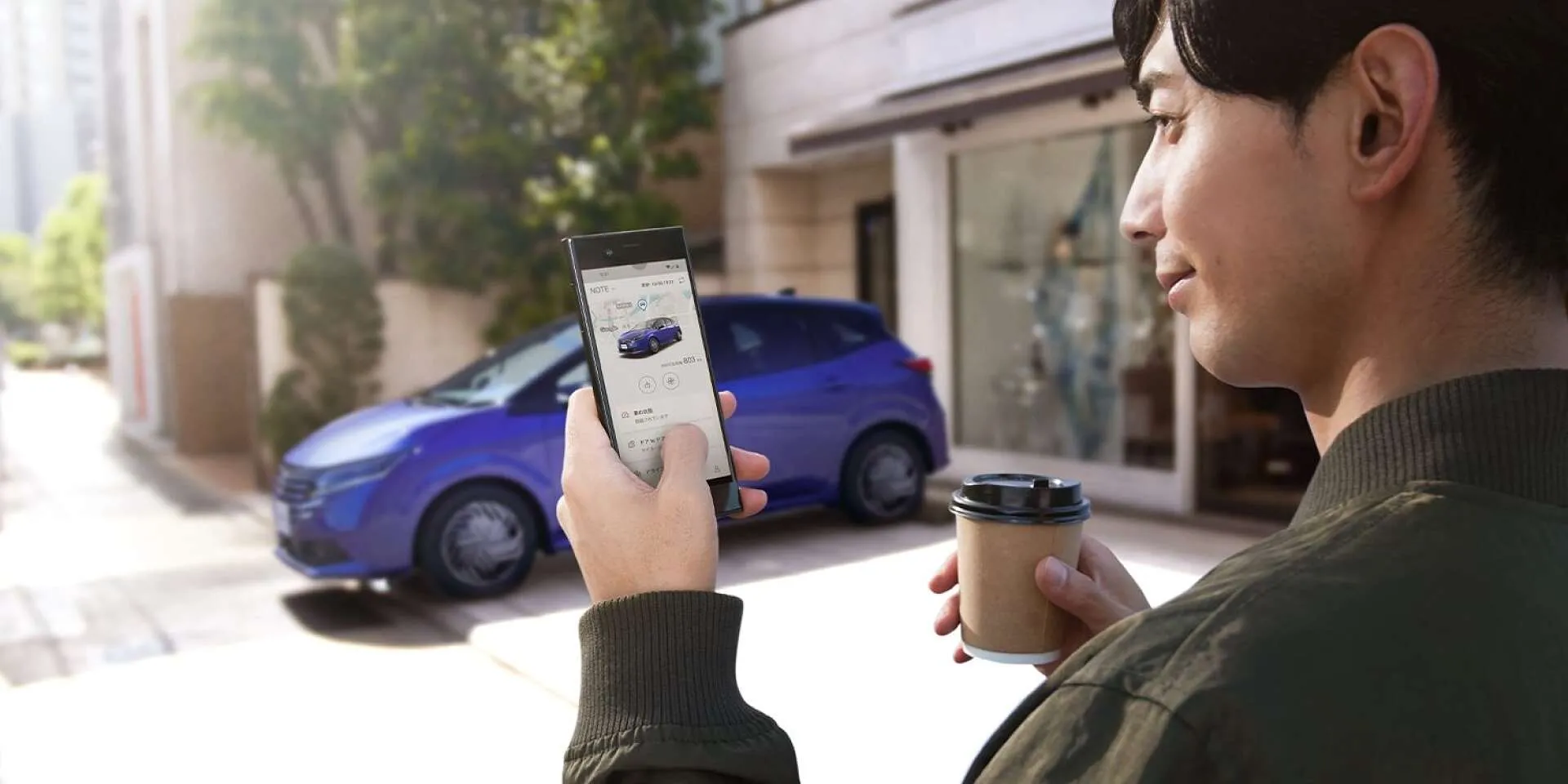 朝の静かな時間、スマートフォン片手にコーヒーを楽しみながら、ふと視線の先には自分の新しい日産 ノートが停まっています。