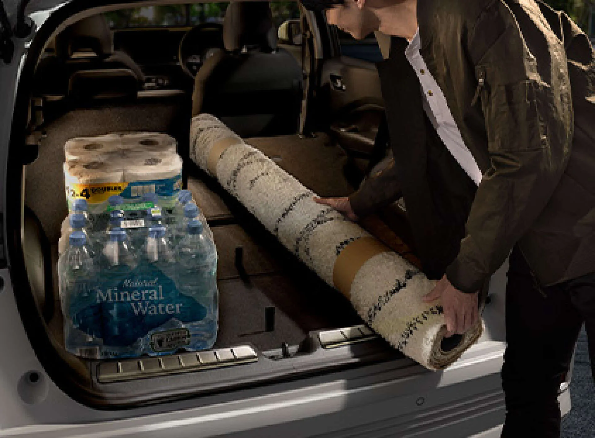 買い物帰りの夕方、トランクに大きなラグマットやミネラルウォーター、日用品を積み込む姿が印象的です。
