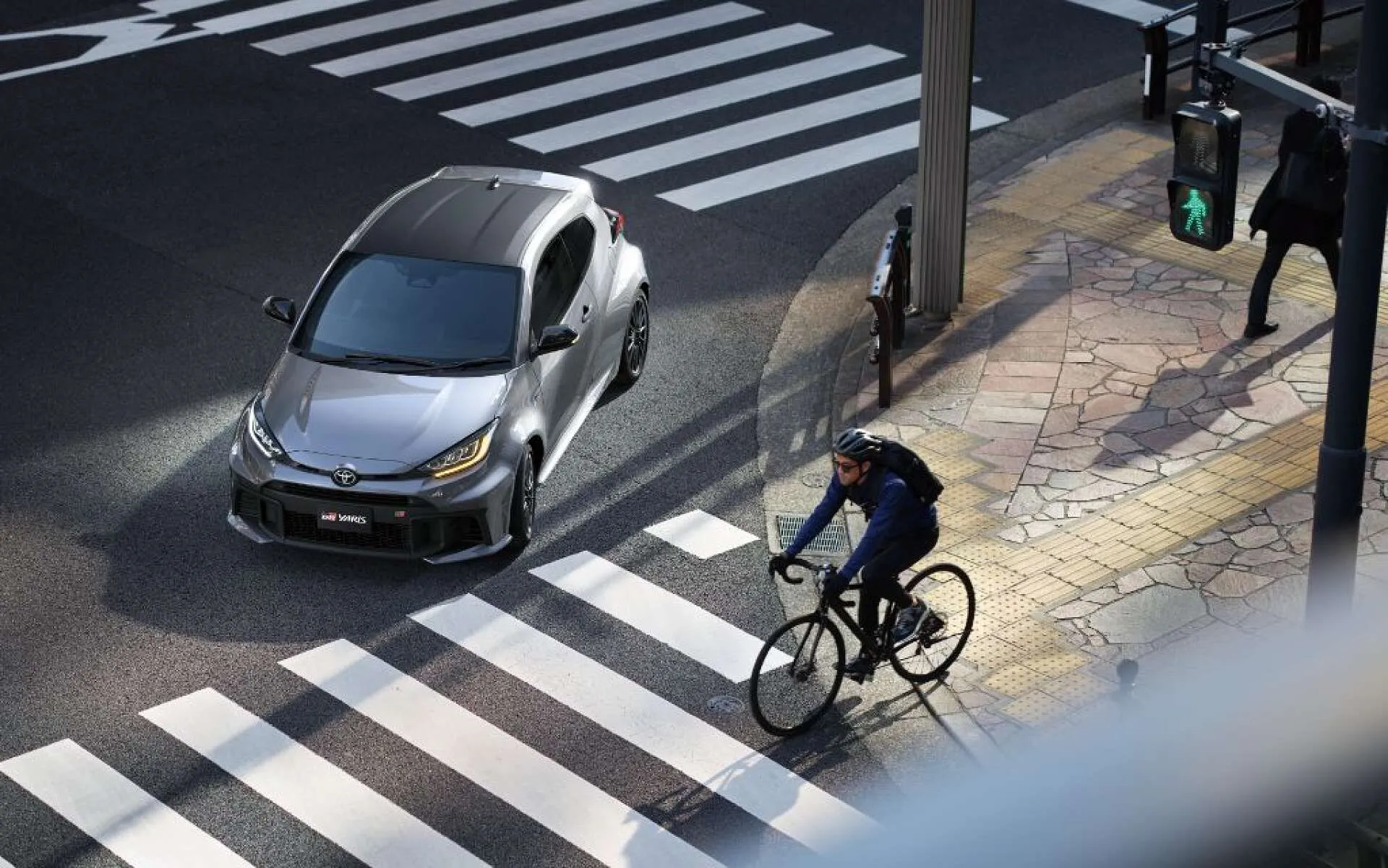 交差点で信号待ちをしているトヨタ ヤリスと、颯爽と自転車で通り過ぎる方の姿が印象的な一枚です。