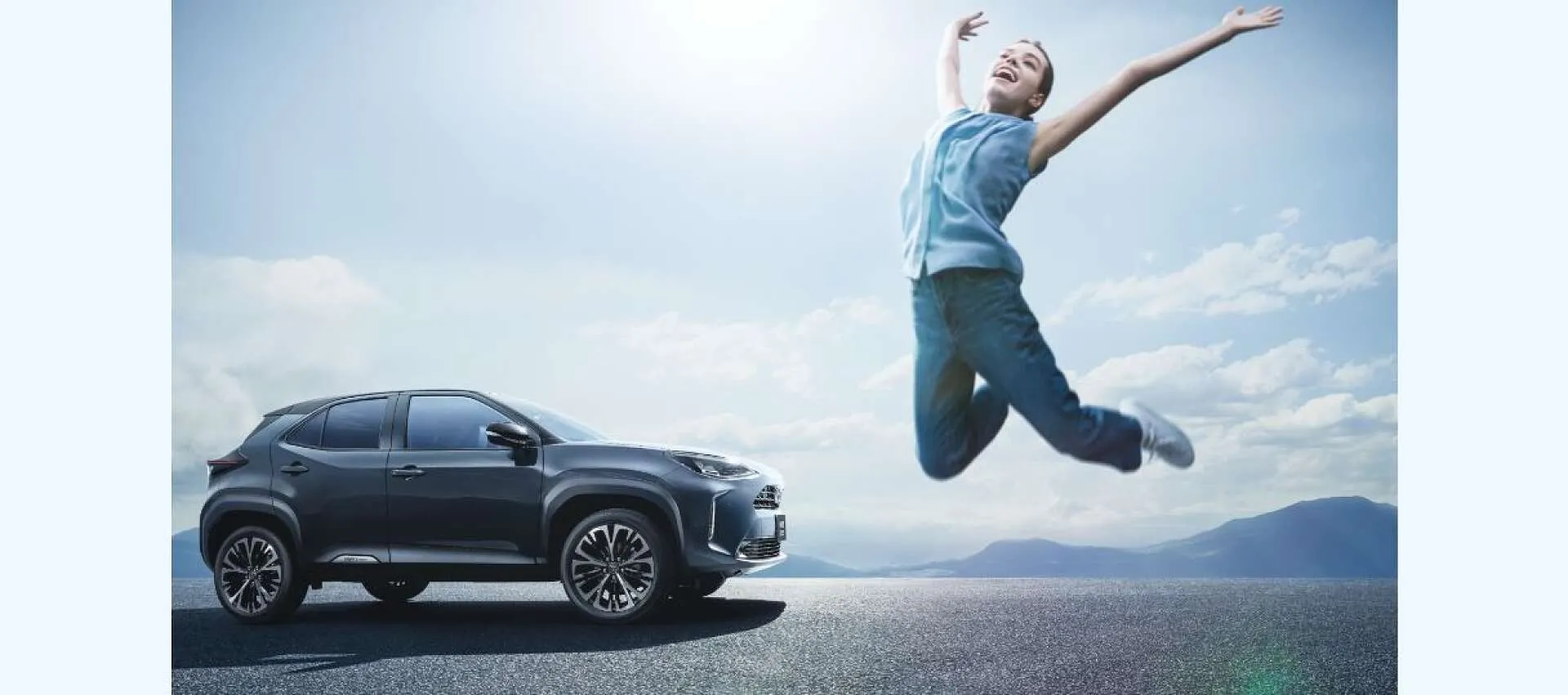 朝の澄んだ空気の中、ヤリスが街並みを背景に