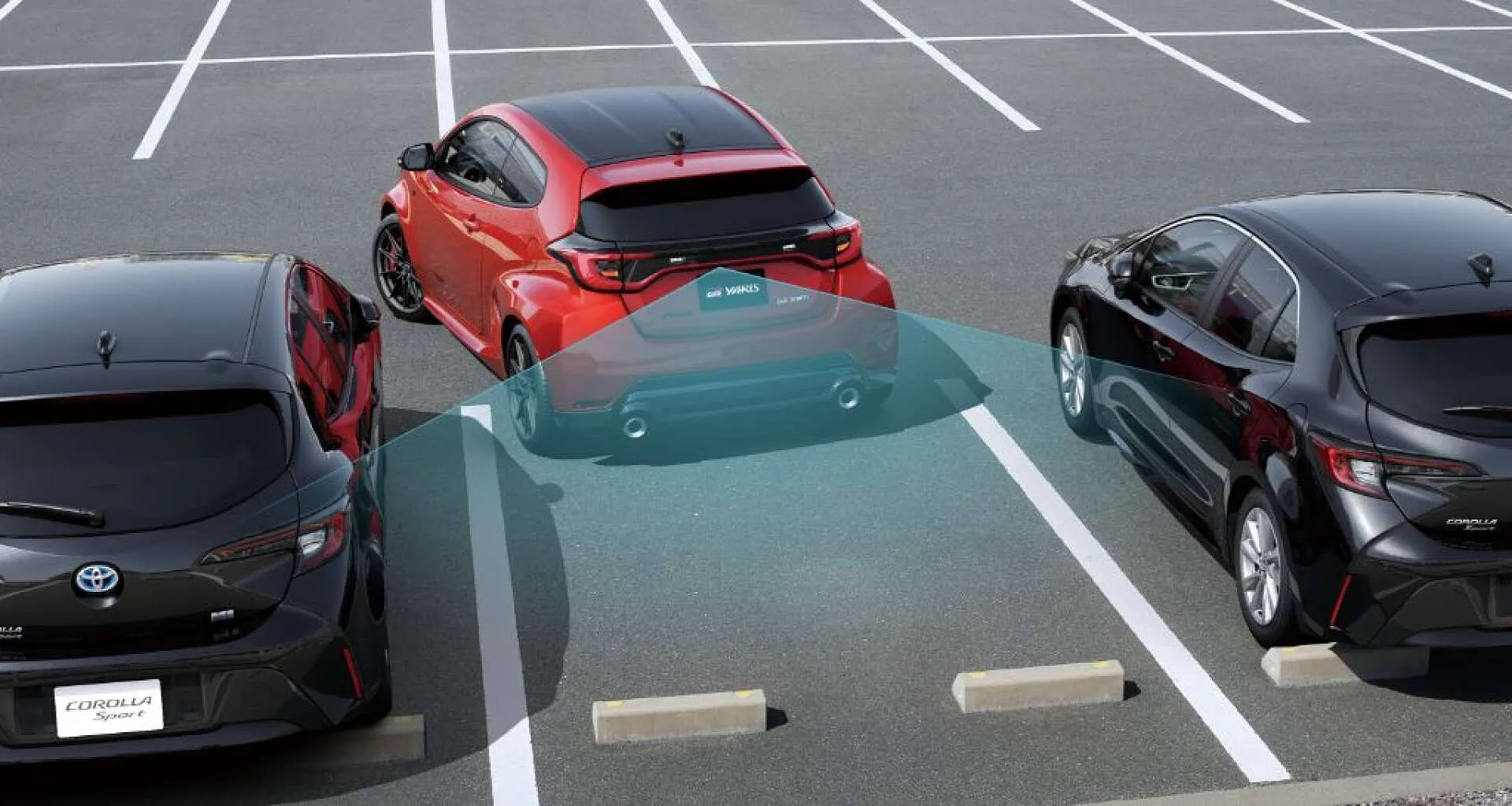駐車場で見かけるヤリスの後ろ姿。鮮やかな赤いボディが目を引きます。