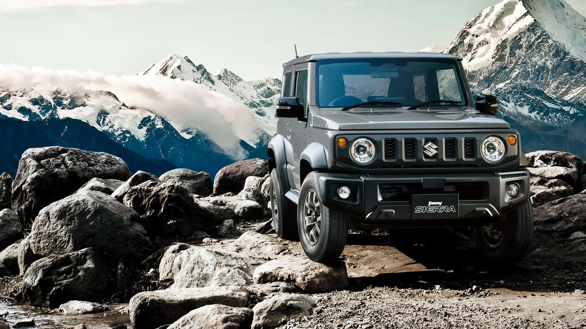 荒々しい岩場にたたずむジムニーシエラの姿が、日常から少し離れた冒険心をくすぐります。