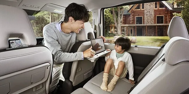 休日の朝、セレナの車内でタブレットを手にしながら、