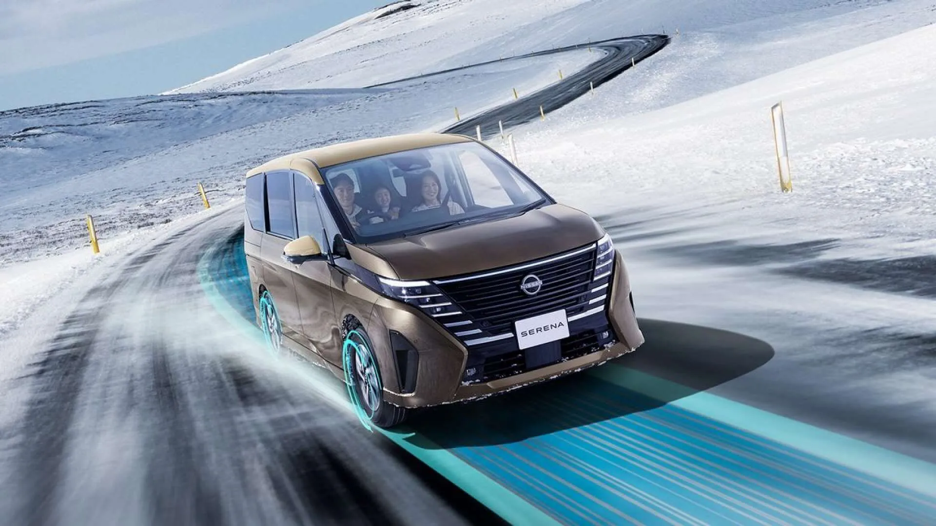 雪景色の中を走るセレナが、家族の笑顔とともに進んでいく様子が印象的です。