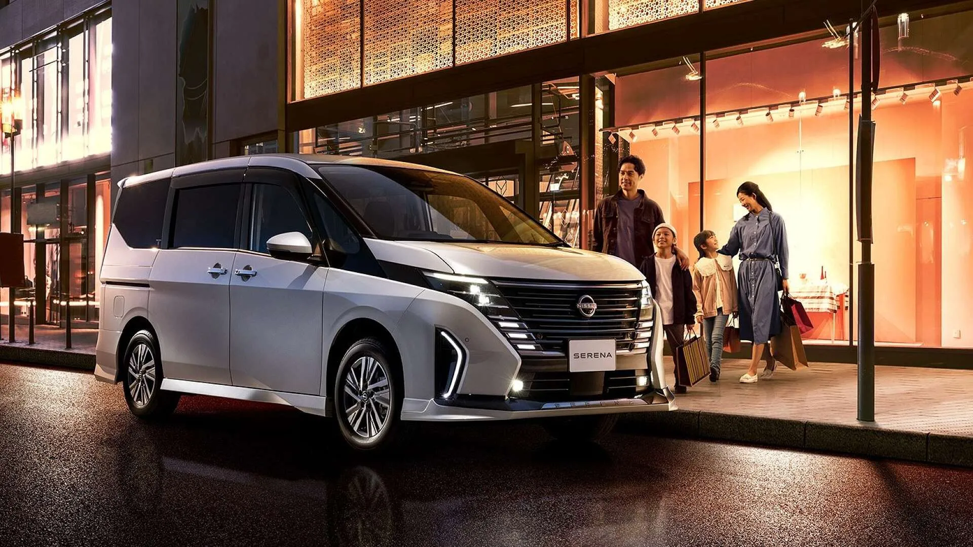 夕暮れのショッピング帰り、家族が笑顔で歩くその横に停まる一台のセレナ。