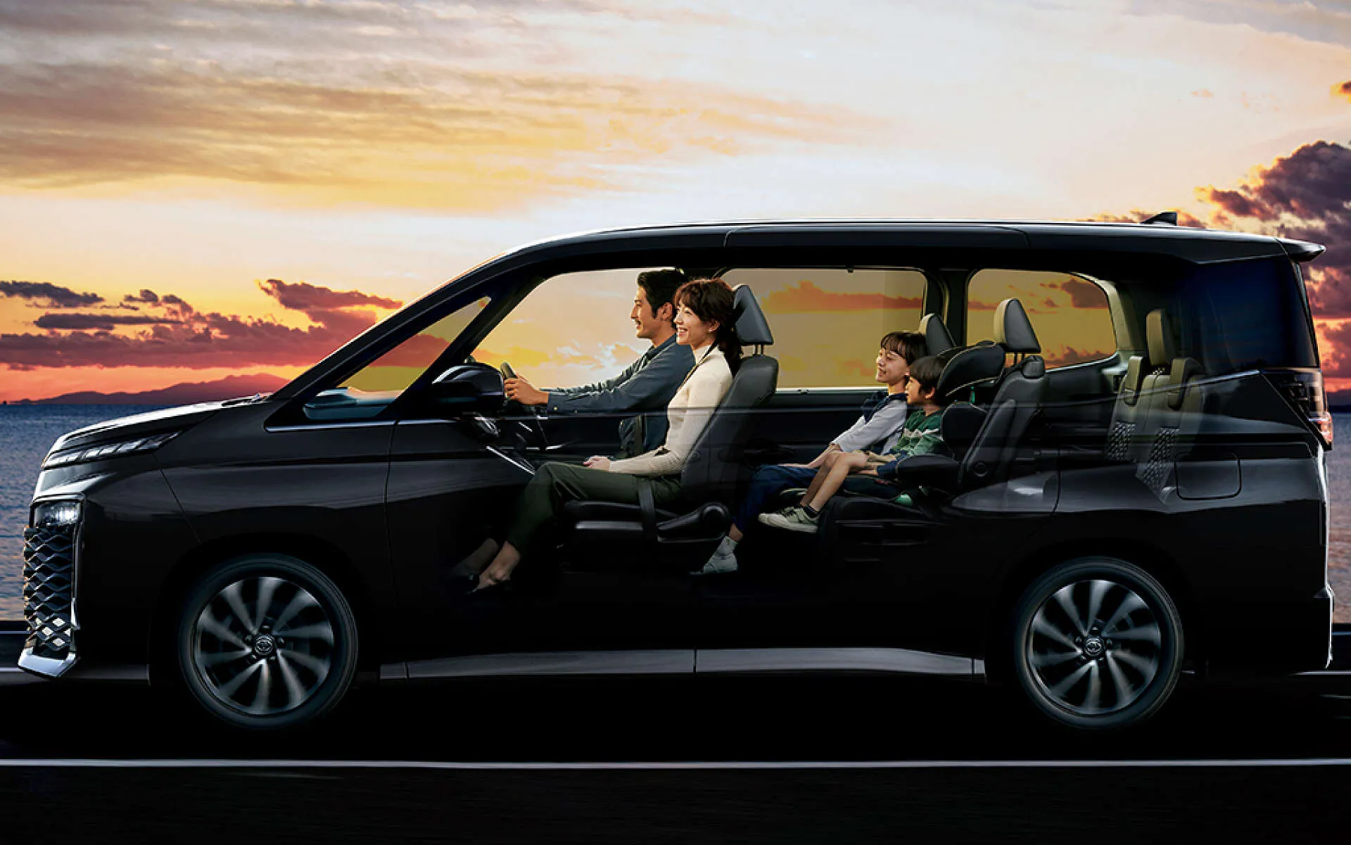 夕焼けをバックに、家族がヴォクシーでゆったりとドライブを楽しんでいる様子が印象的です。
