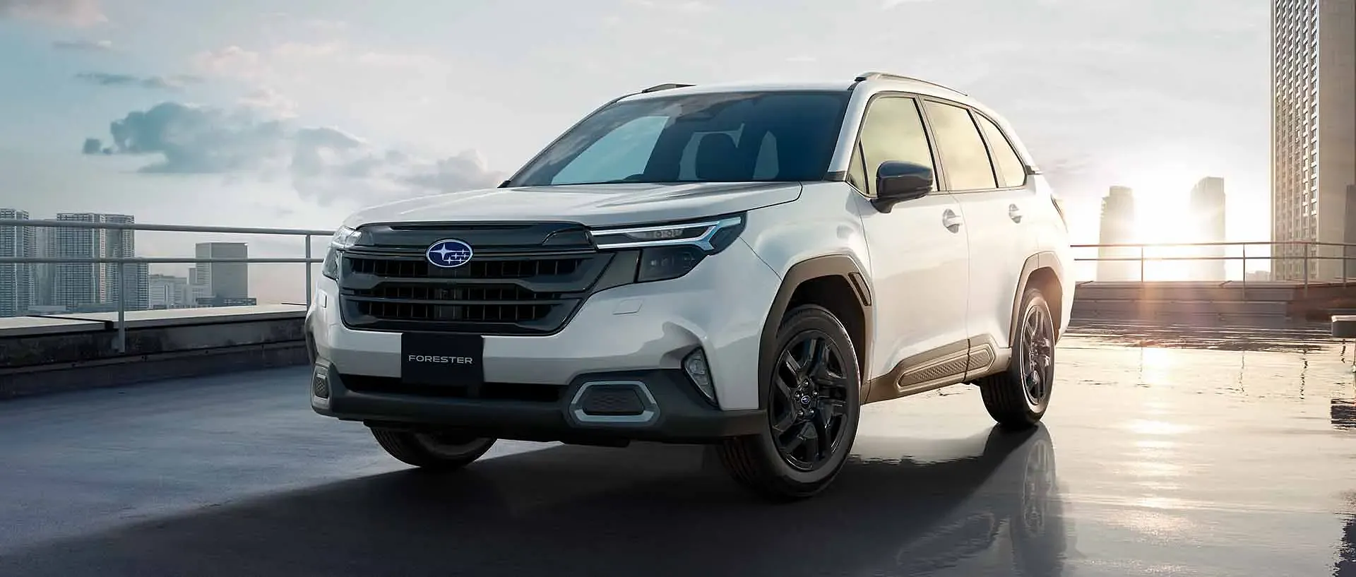 朝焼けのビル街を背景に、フォレスターが静かに佇んでいます。