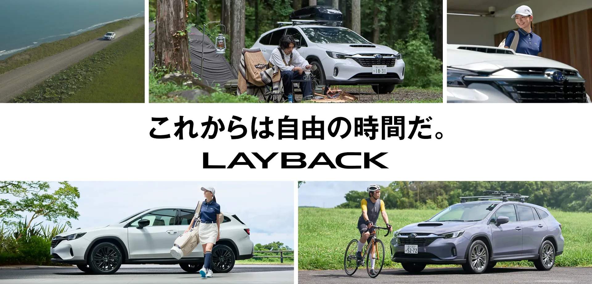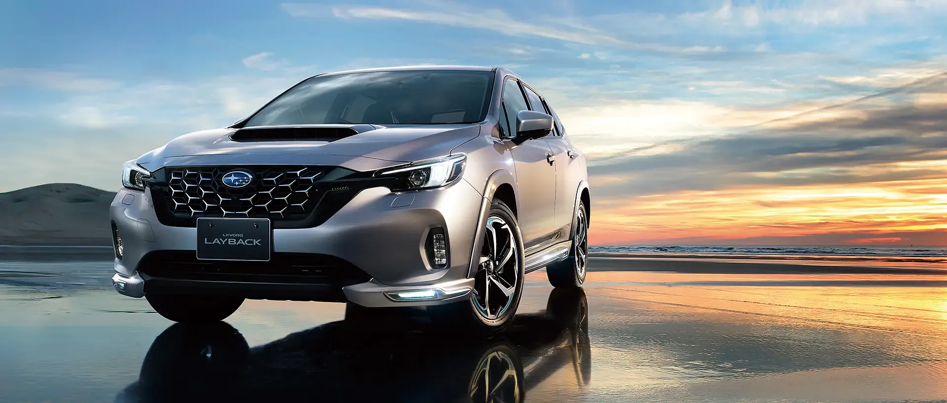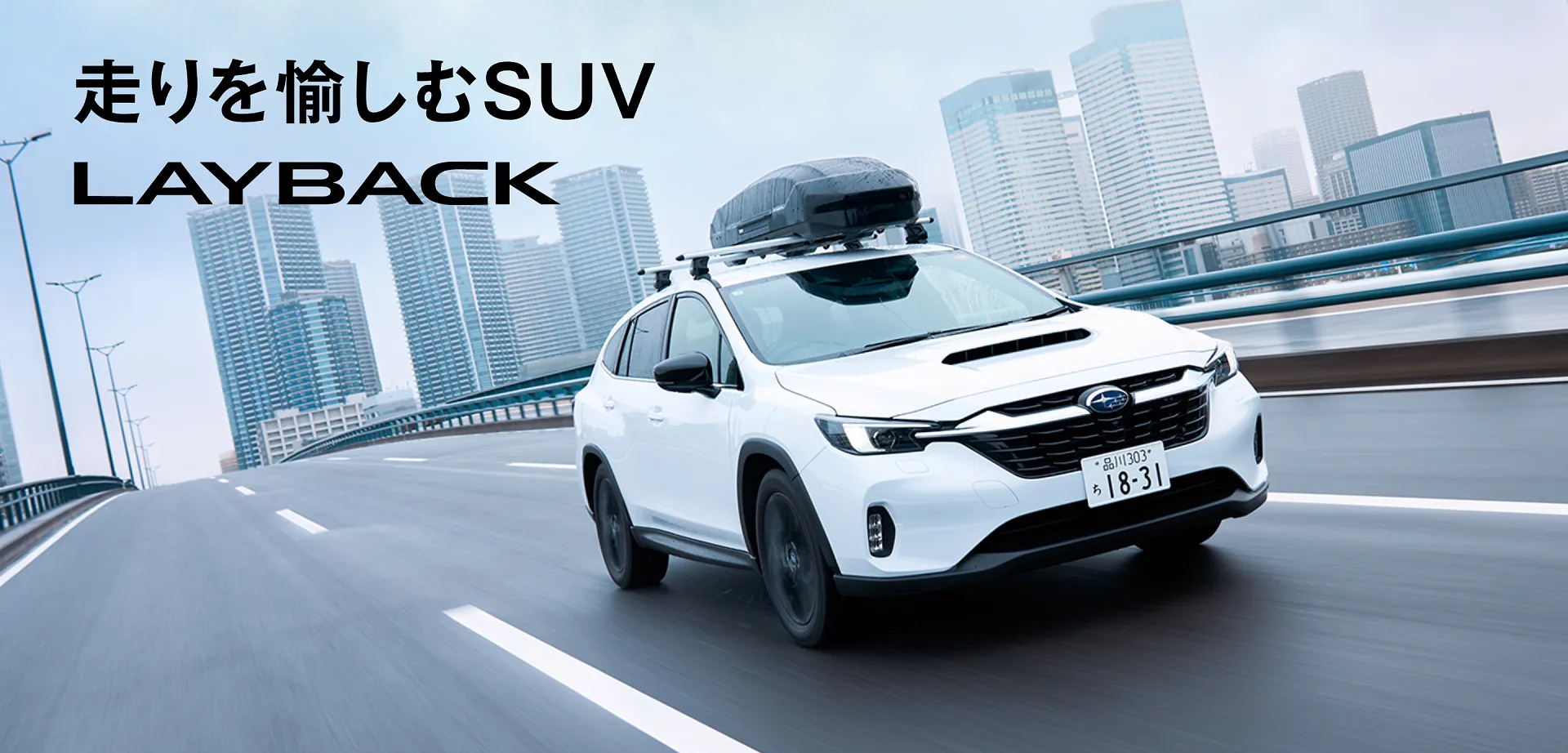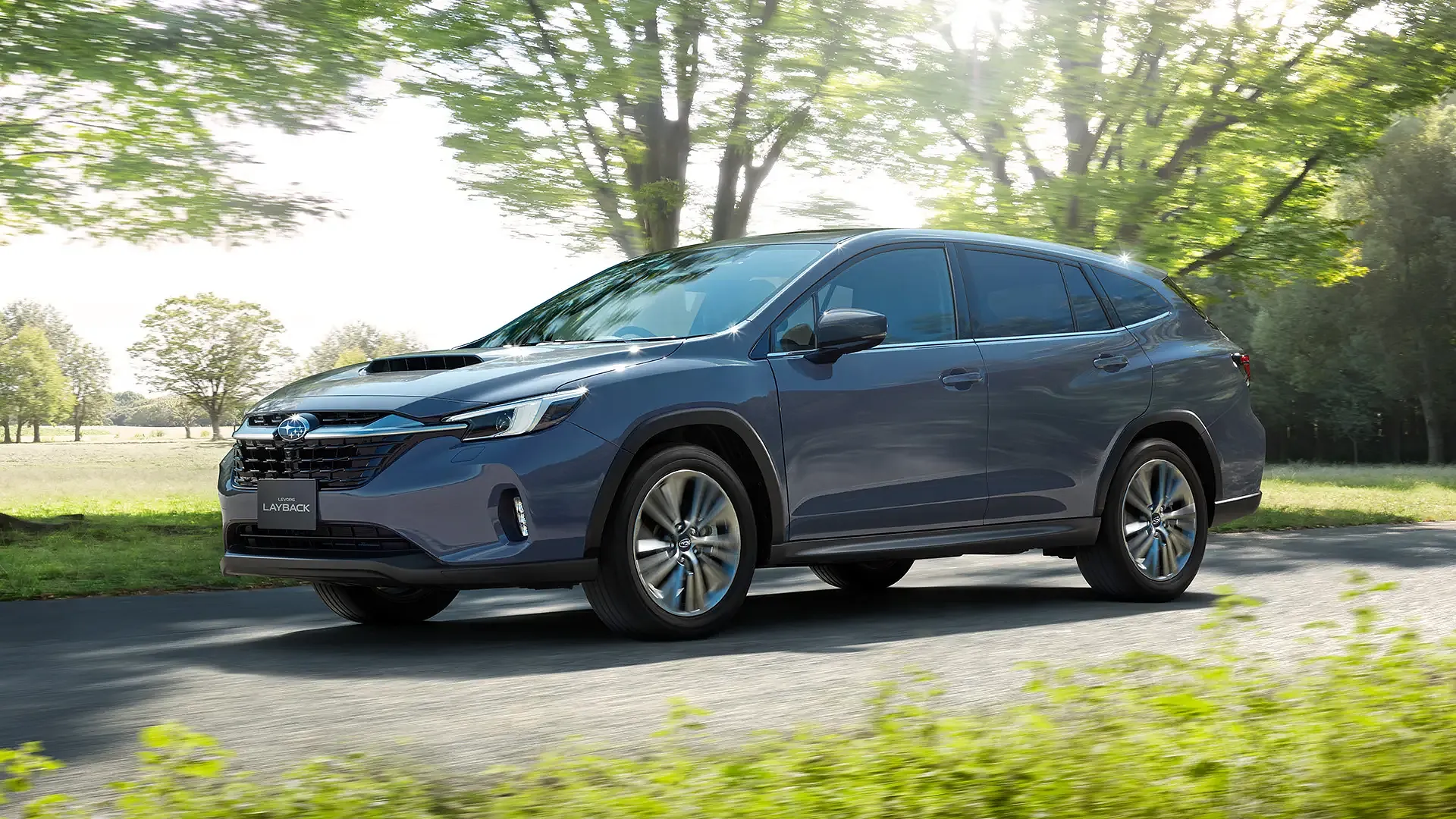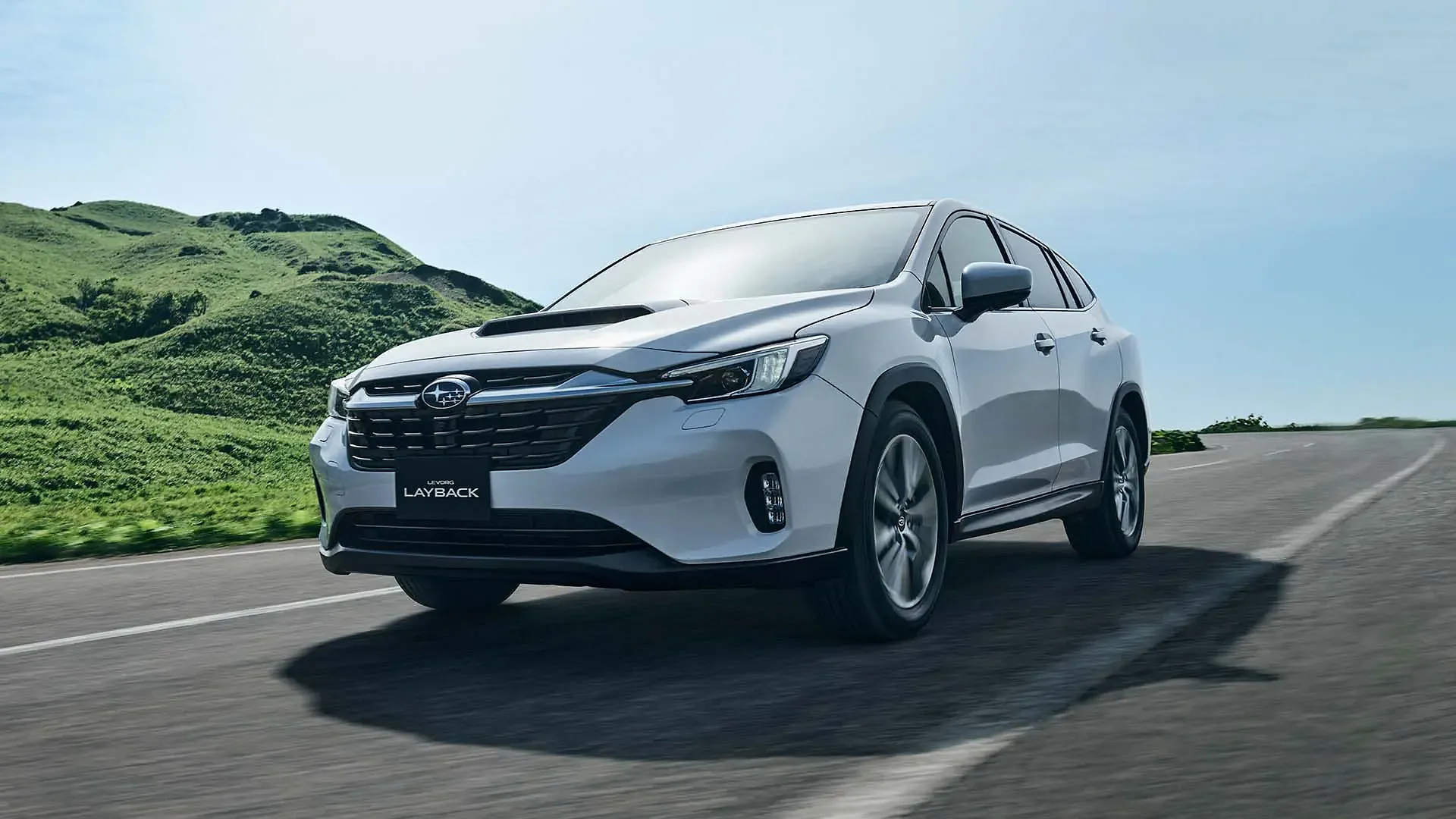 澄んだ青空と広がる緑の丘を背景に、スバル レイバックが颯爽と走り抜けています。