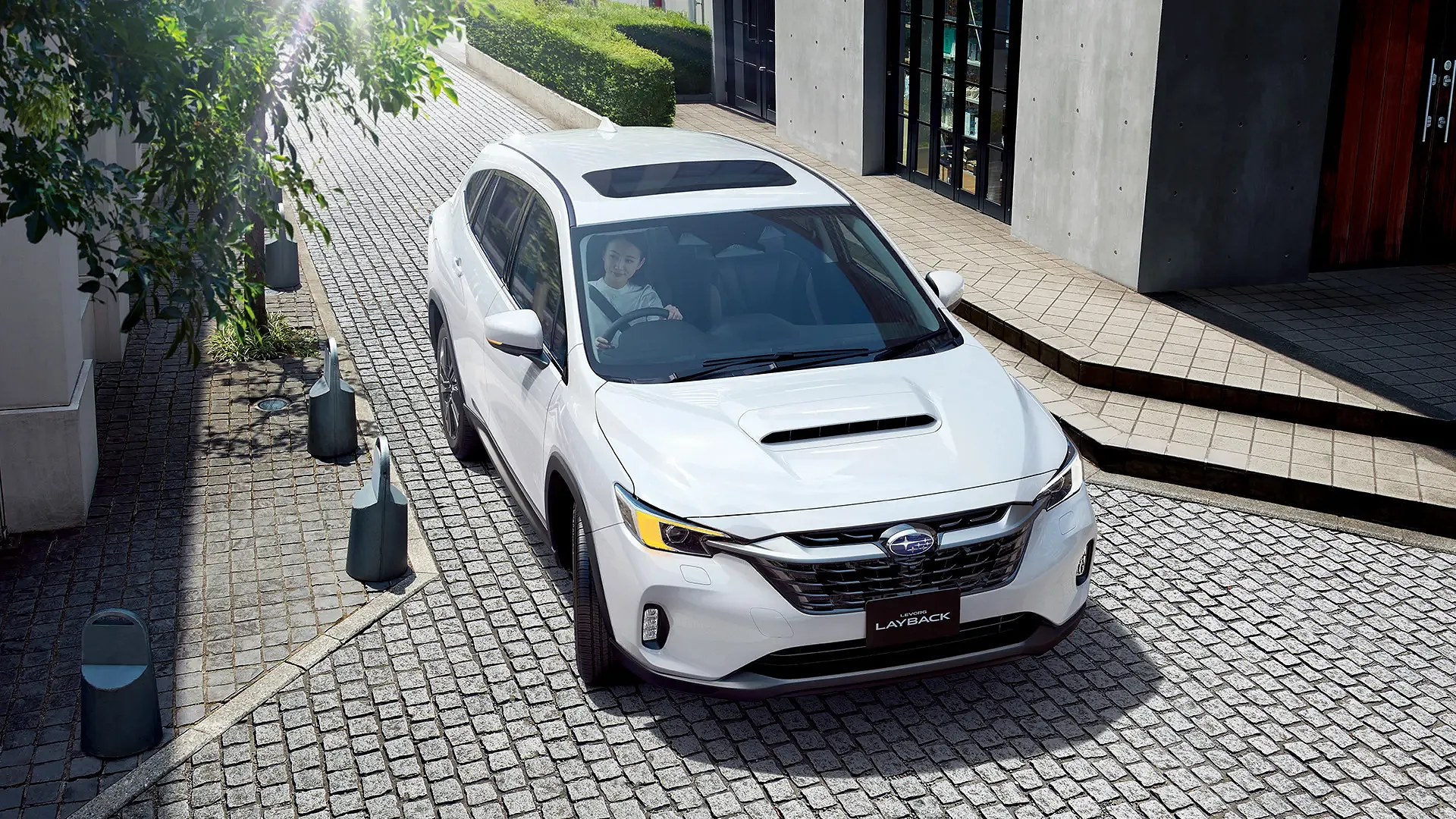 朝のやわらかな光が差し込む石畳の道を、白いSUVが静かに進んでいきます。