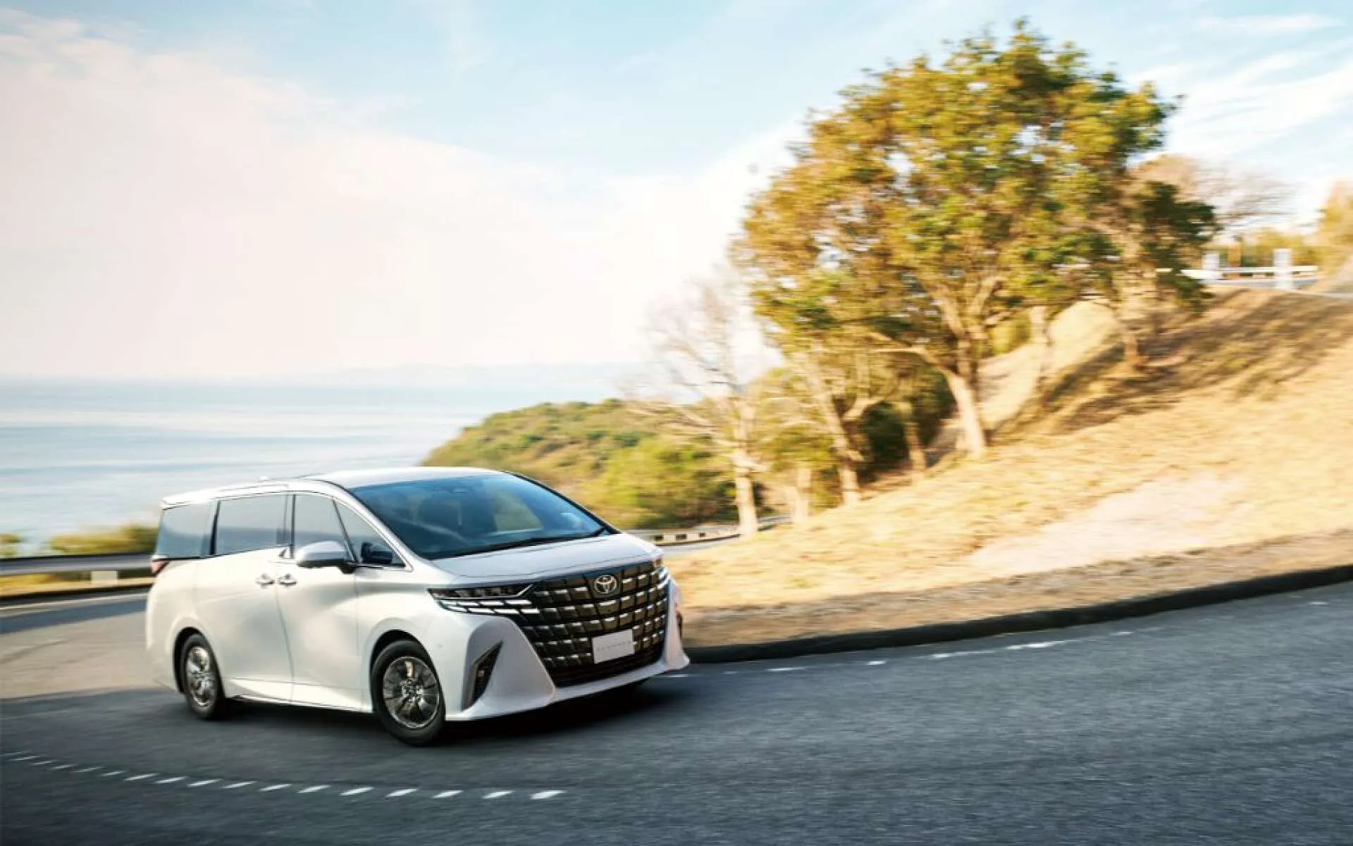 海沿いの道をゆったりと走るアルファードが、家族や仲間とのドライブにぴったりな一台だと感じさせてくれます。