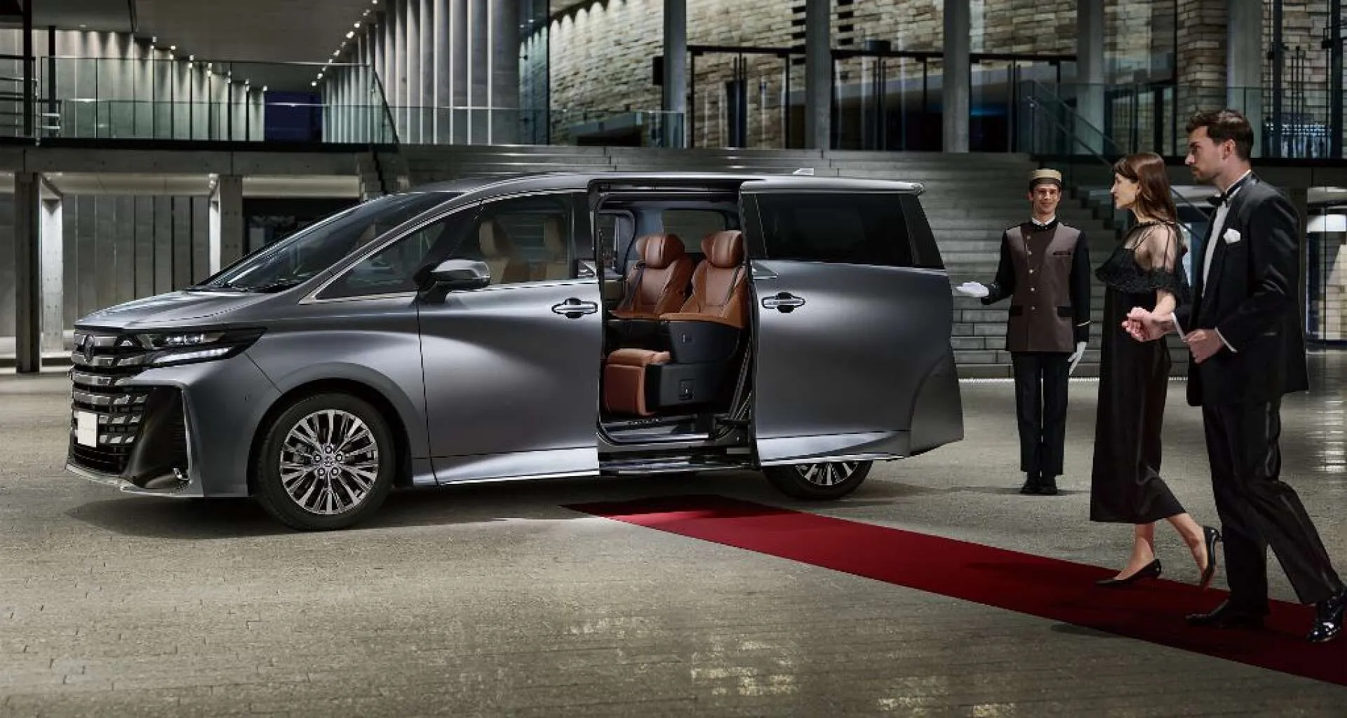 ヴェルファイアのスライドドアが開くと、赤いカーペットに足を踏み入れる瞬間が
