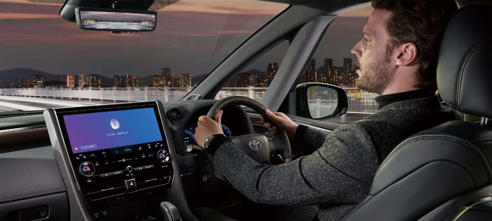 夕暮れ時の都市の夜景をバックに、ゆったりとハンドルを握る時間は、日常の忙しさから少し離れて自分だけのひとときを感じられる瞬間です。