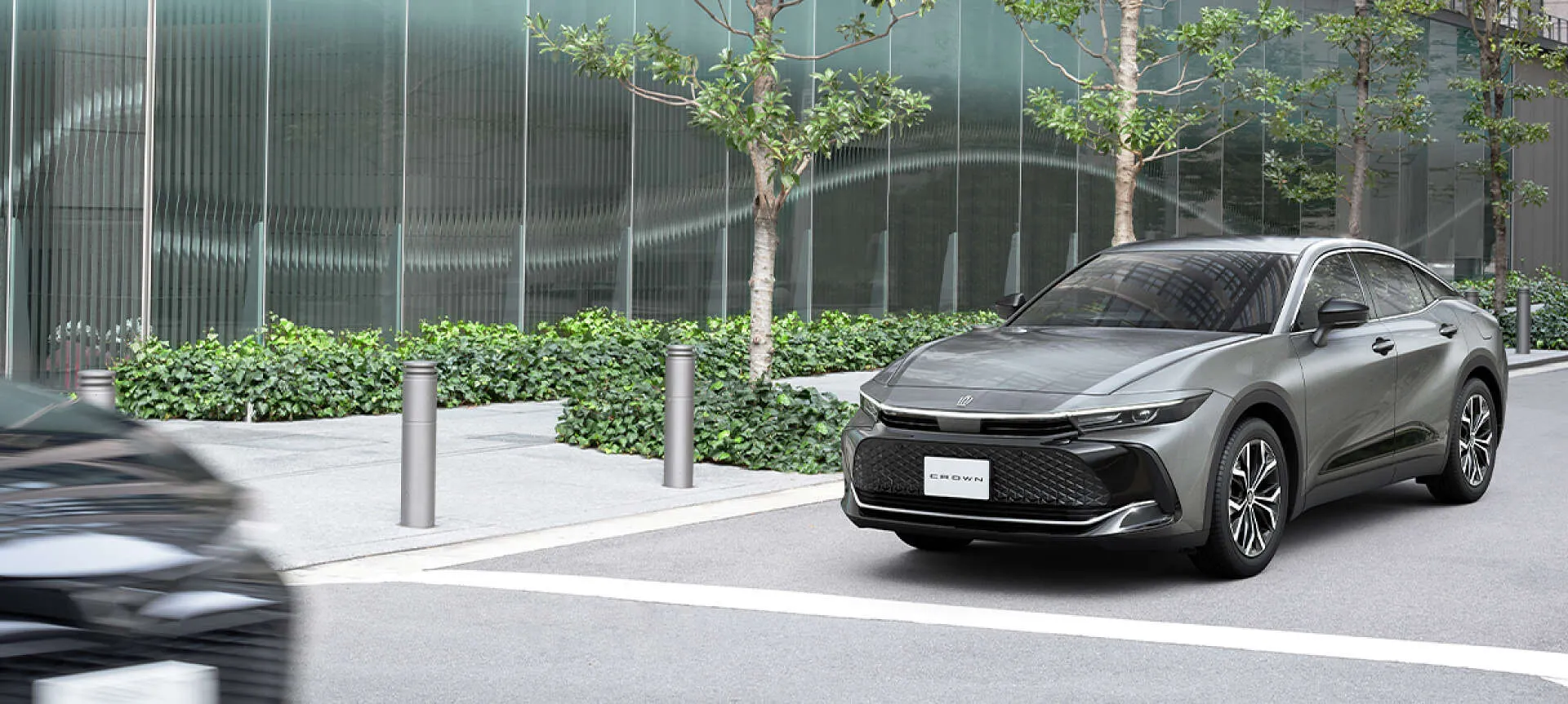 朝の静かなオフィス街に、クラウン クロスオーバーがそっと佇んでいます。