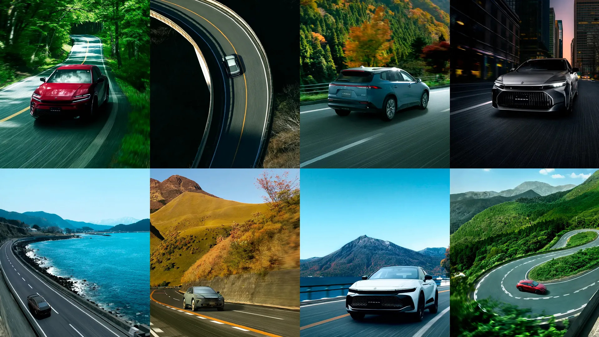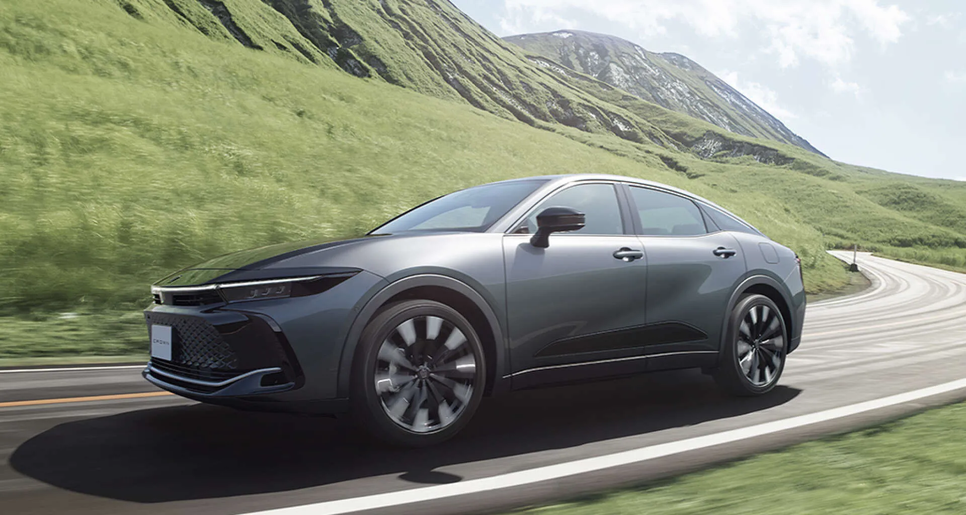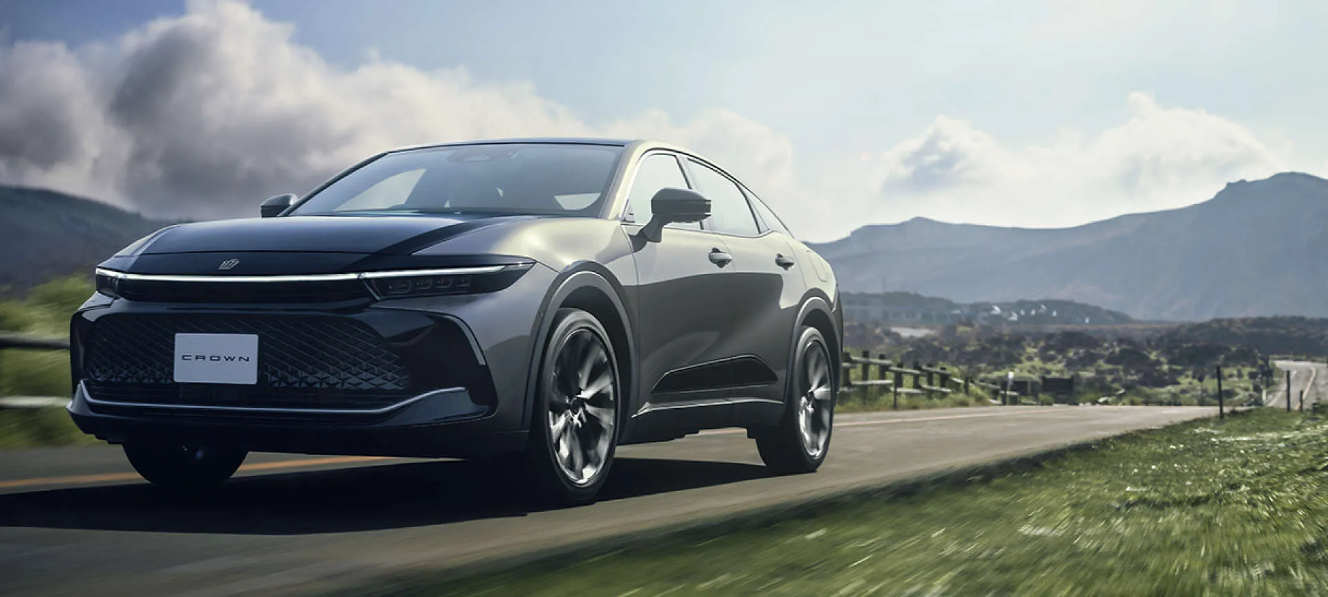 朝の光が差し込む中、クラウン クロスオーバーが静かな田舎道を走り抜けていく様子は、