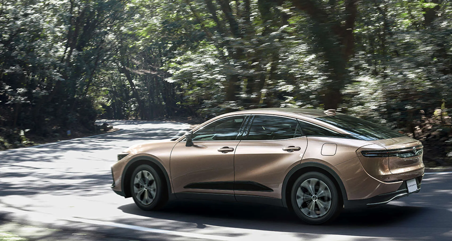 木漏れ日が差し込む森の道を、静かに走り抜ける一台のクロスオーバー。