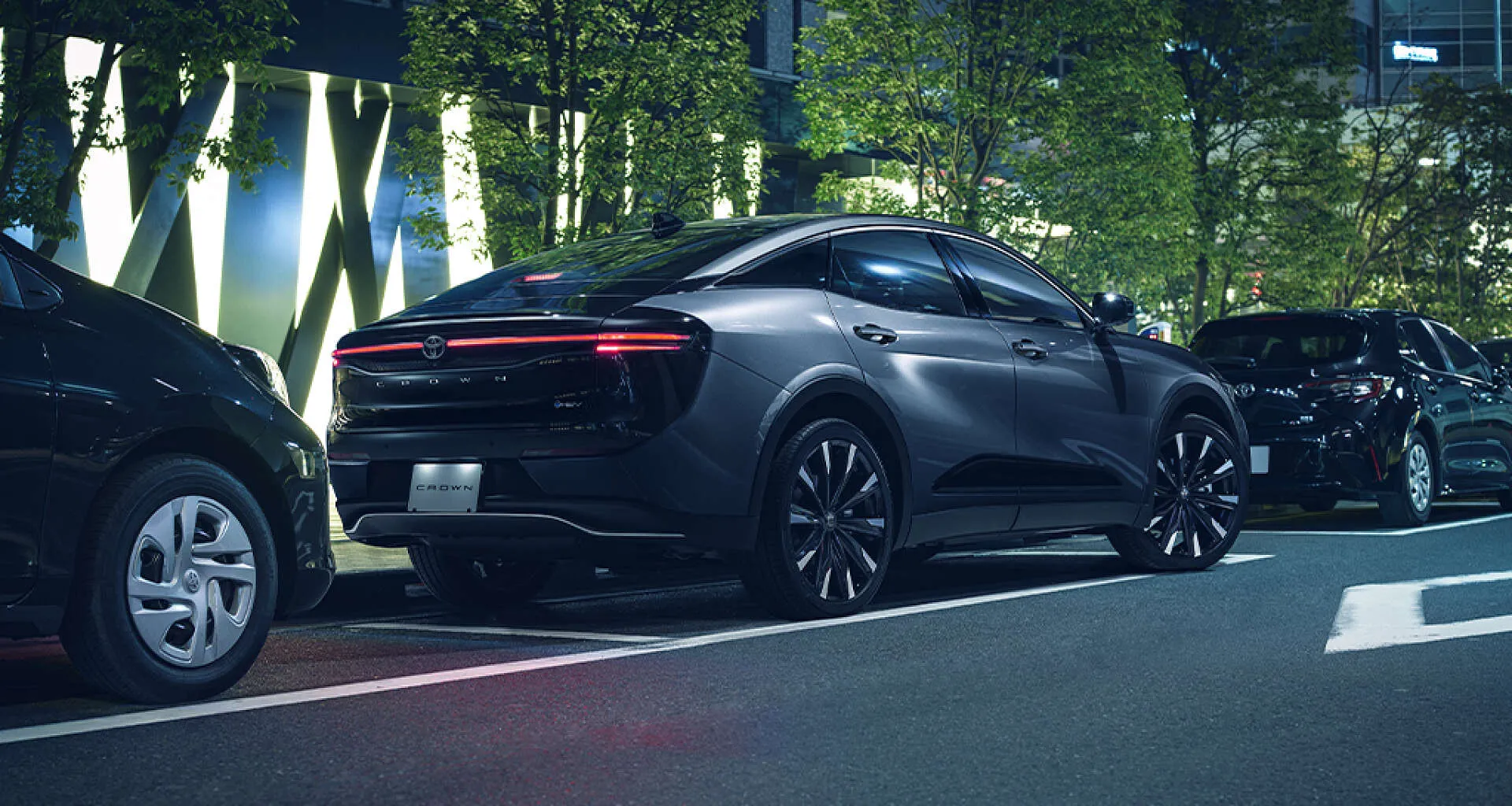 夜の街並みに溶け込むクラウン クロスオーバーが、