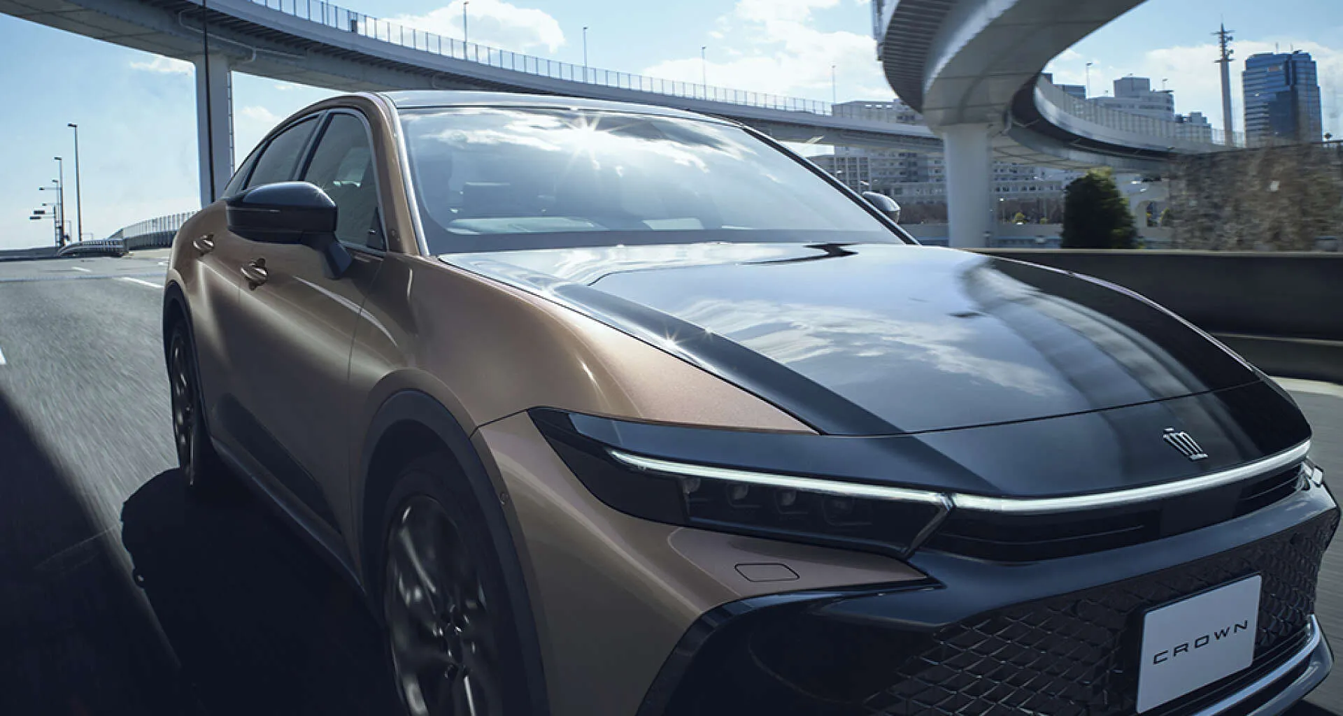 朝の光を浴び走るクラウン クロスオーバーが、静岡県富士市の街並みに溶け込んでいます。